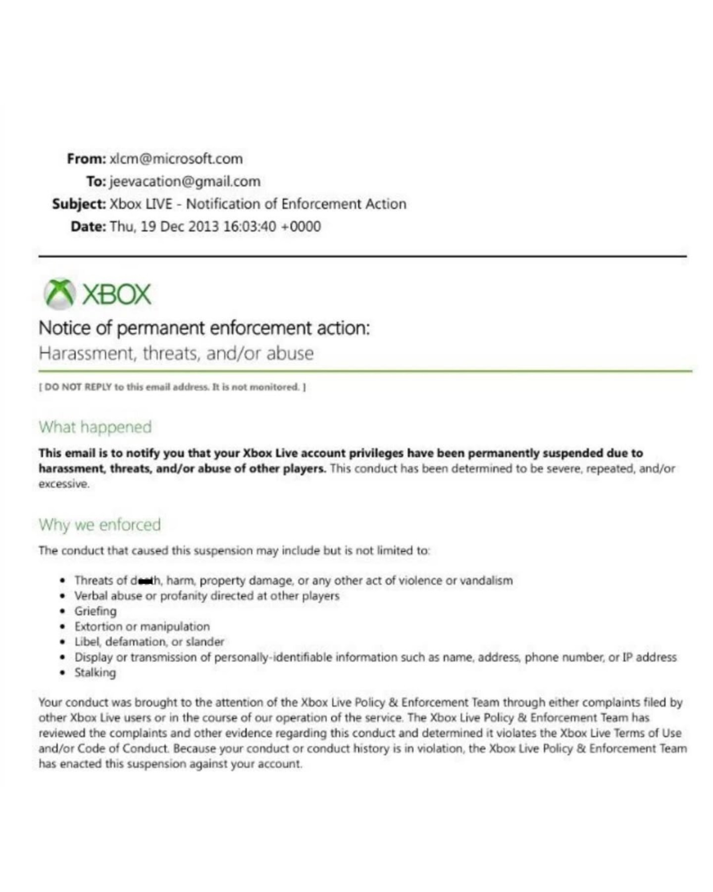 A second email explains that the suspension was also tied to a New York Attorney General partnership with Microsoft, which worked to remove registered s*x offenders from online gaming services to protect younger users. Any account connected to their registry was automatically shut down under that program.