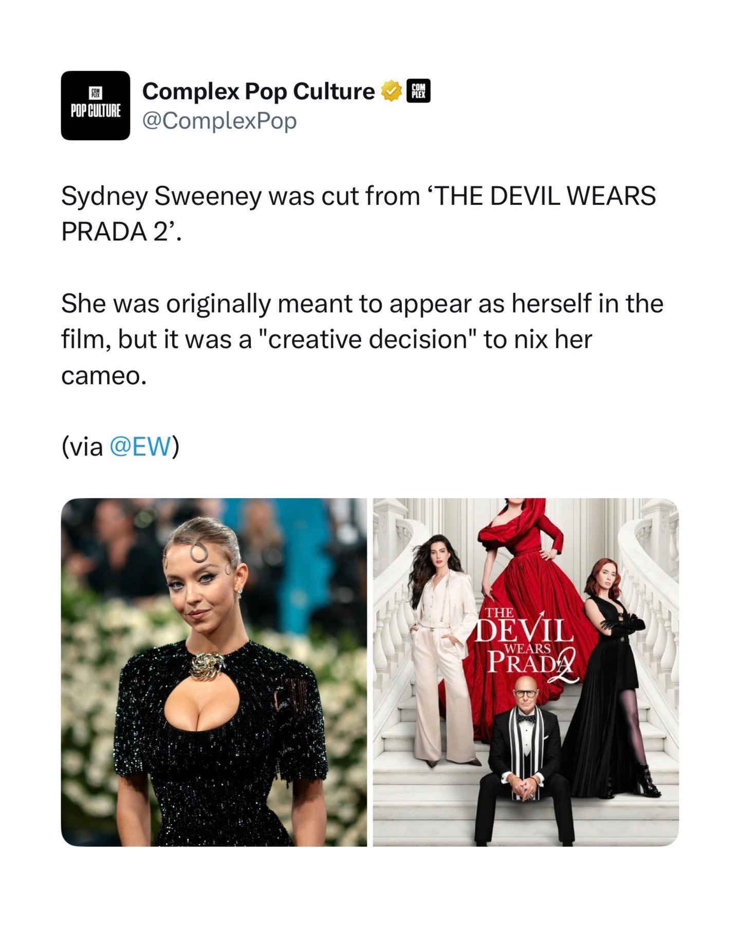 Sydney Sweeneyâs cameo in âTHE DEVIL WEARS PRADA 2â was cut from the film as part of a âcreative decisionâ from the studio.