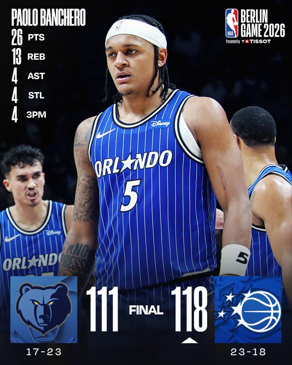 🏀 THURSDAY’S FINAL SCORES 🏀 Paolo Banchero records the double-double as the @OrlandoMagic get the win in the NBA Berlin Game presented by Tissot! Anthony Black: 21 PTS, 6 REB, 7 AST, 4 3PM Franz Wagner: 18 PTS, 9 REB Jaren Jackson Jr.: 30 PTS, 2 STL, 2 BLK