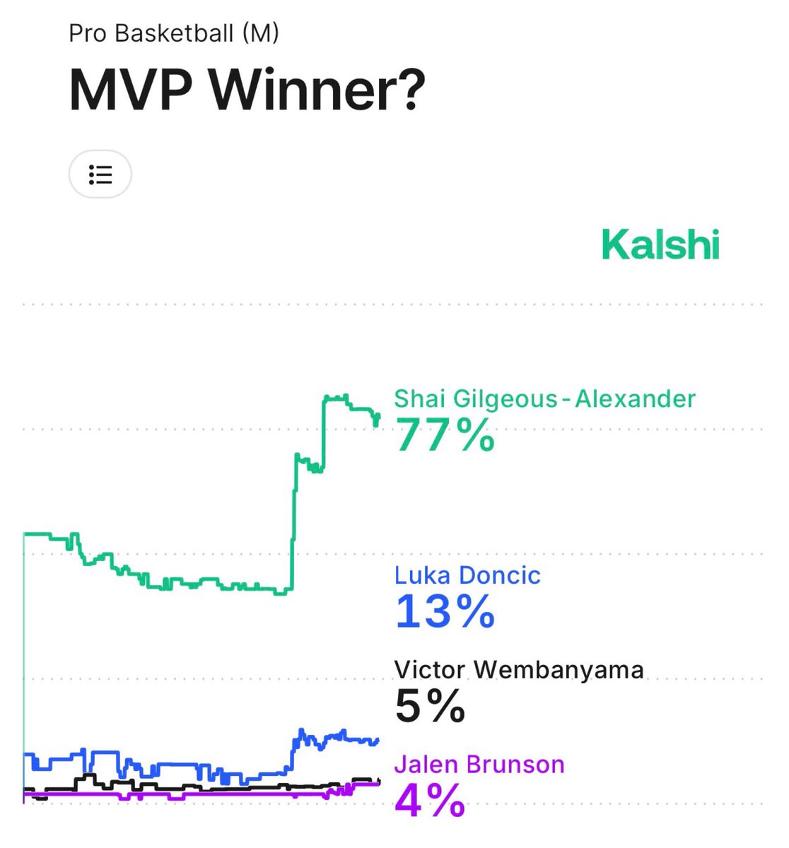NEW: With Jokic’s injury, the NBA MVP Race on Kalshi has shaken up: 77% — Shai Gilgeous-Alexander 13% — Luka Doncic 5% — Victor Wembanyama 4% — Jalen Brunson 3% — Cade Cunningham