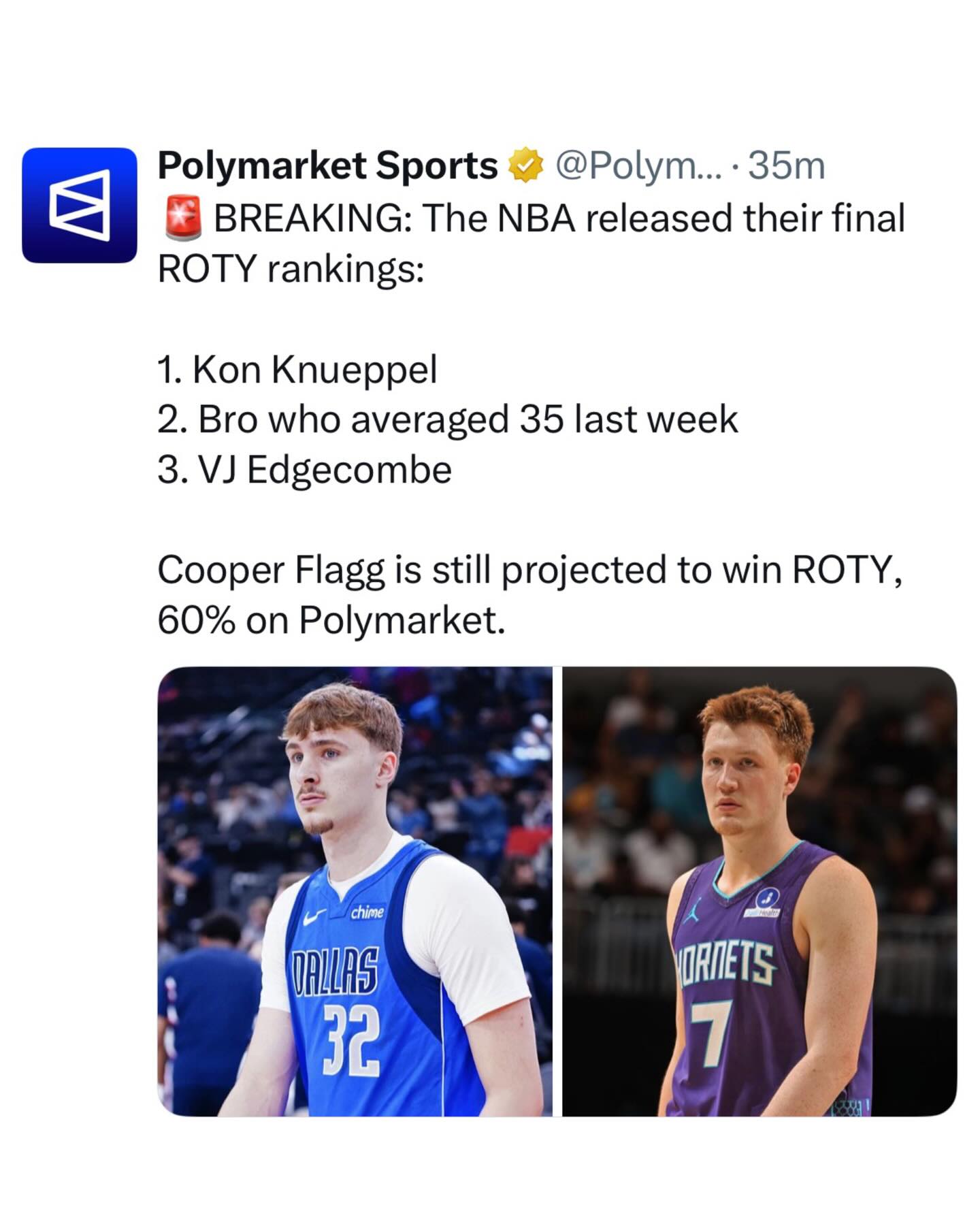 The NBA released their final ROTY rankings: 1. Kon Knueppel 2. Bro who averaged 35 last week 3. VJ Edgecombe