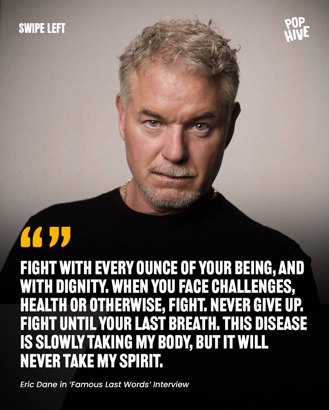 Netflix has released the posthumous interview special 'Famous Last Words' featuring Eric Dane, where he reflects on his life, career, and battle with ALS, and shares his final words to his daughters.