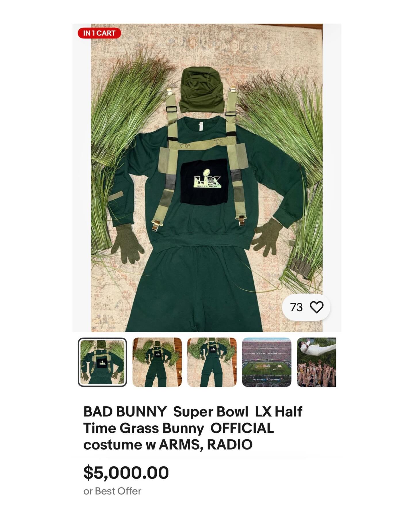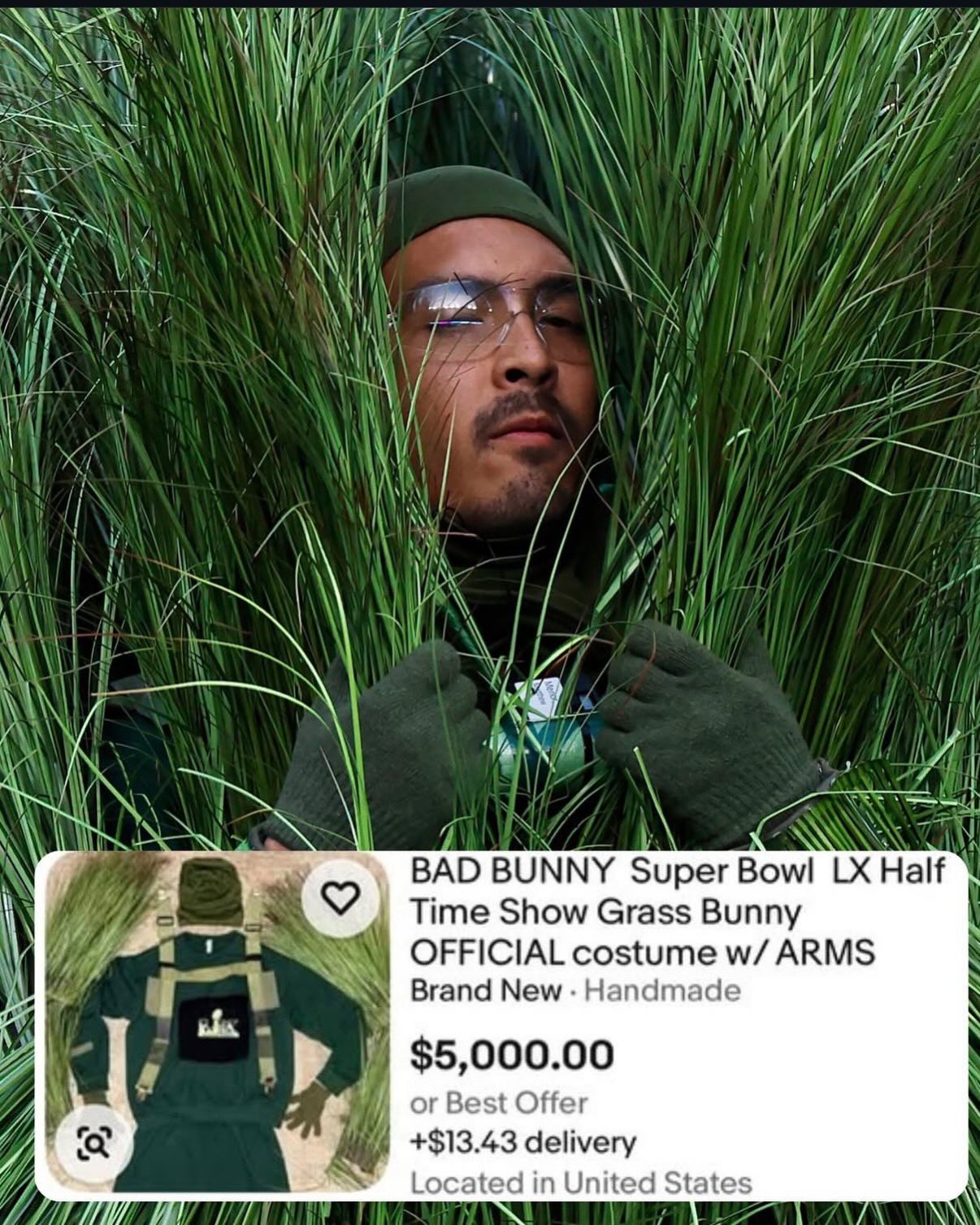 Bad Bunny’s Super Bowl grass costumes from his halftime show are listed for about $5,000 on resale sites such as eBay.
