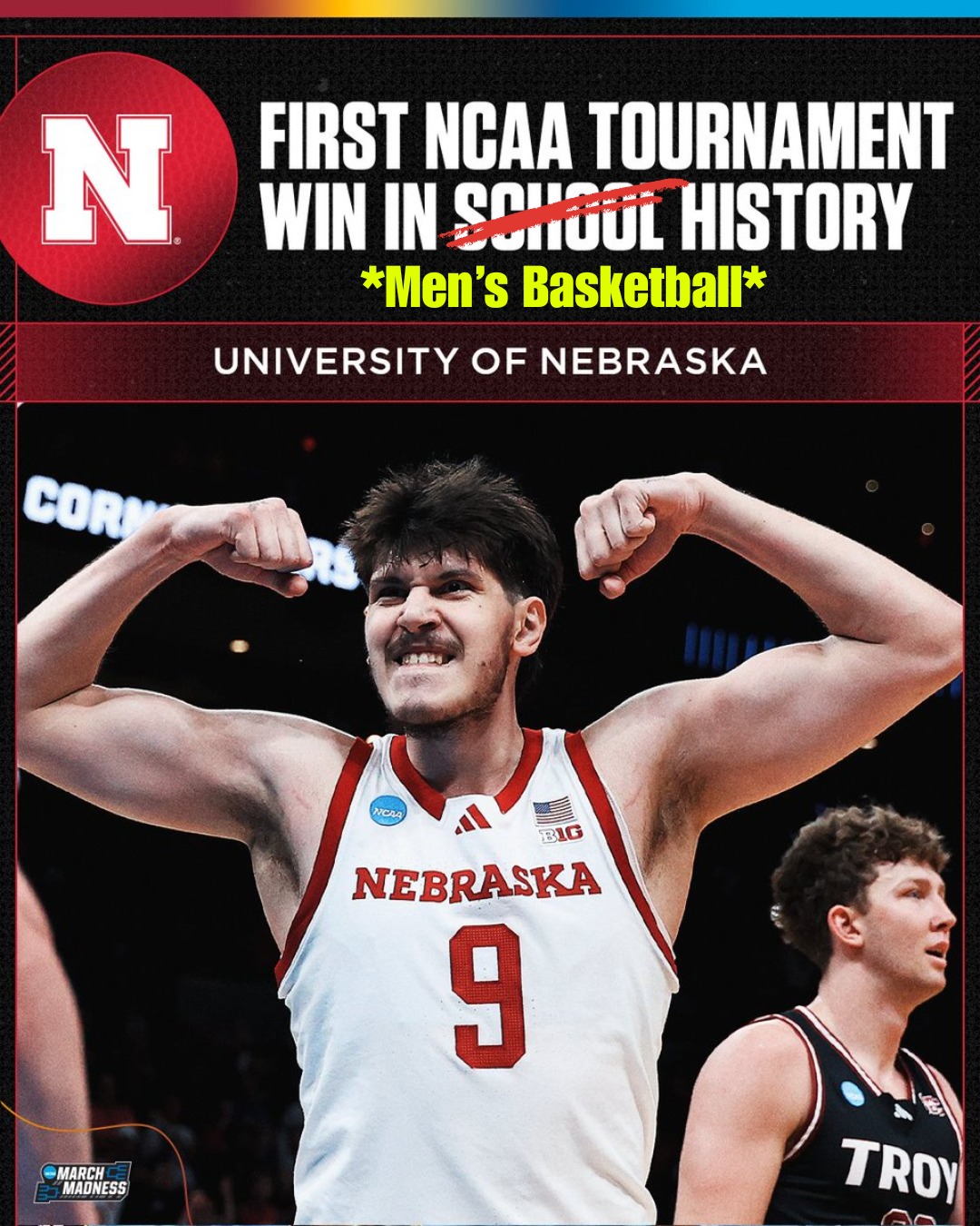 After eight consecutive opening-round losses from 1986 to 2024, Nebraska men’s basketball finally secured its first NCAA Tournament victory, defeating Troy 76–47 — a massive milestone for the program. 🔥