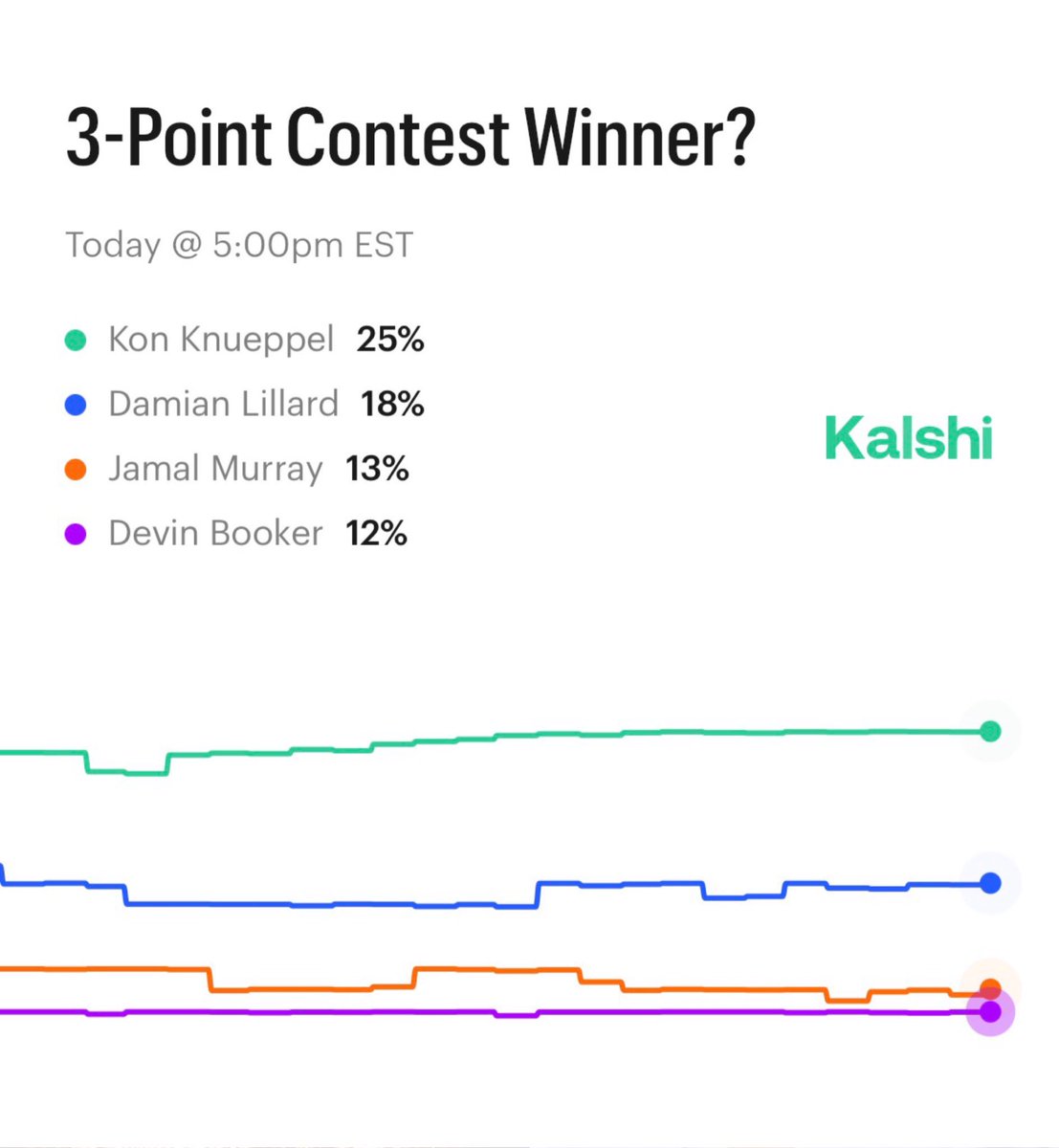 3-Point Contest Favorites, per Kalshi: 25% — Kon Knueppel 18% — Damian Lillard 13% — Jamal Murray 12% — Devin Booker 12% — Tyrese Maxey 11% — Donovan Mitchell 9% — Norman Powell 5% — Bobby Portis