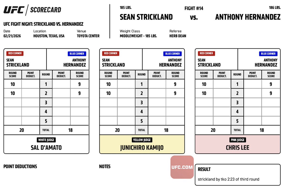 #UFCHouston Official Result: Sean Strickland (@SStricklandMMA) defeats Anthony Hernandez via TKO at 2:33 of Round 3. Complete Main Card Results ➡️ ufc.ac/46huaa7 Complete Scorecards ➡️ ufc.ac/4tNY8fN