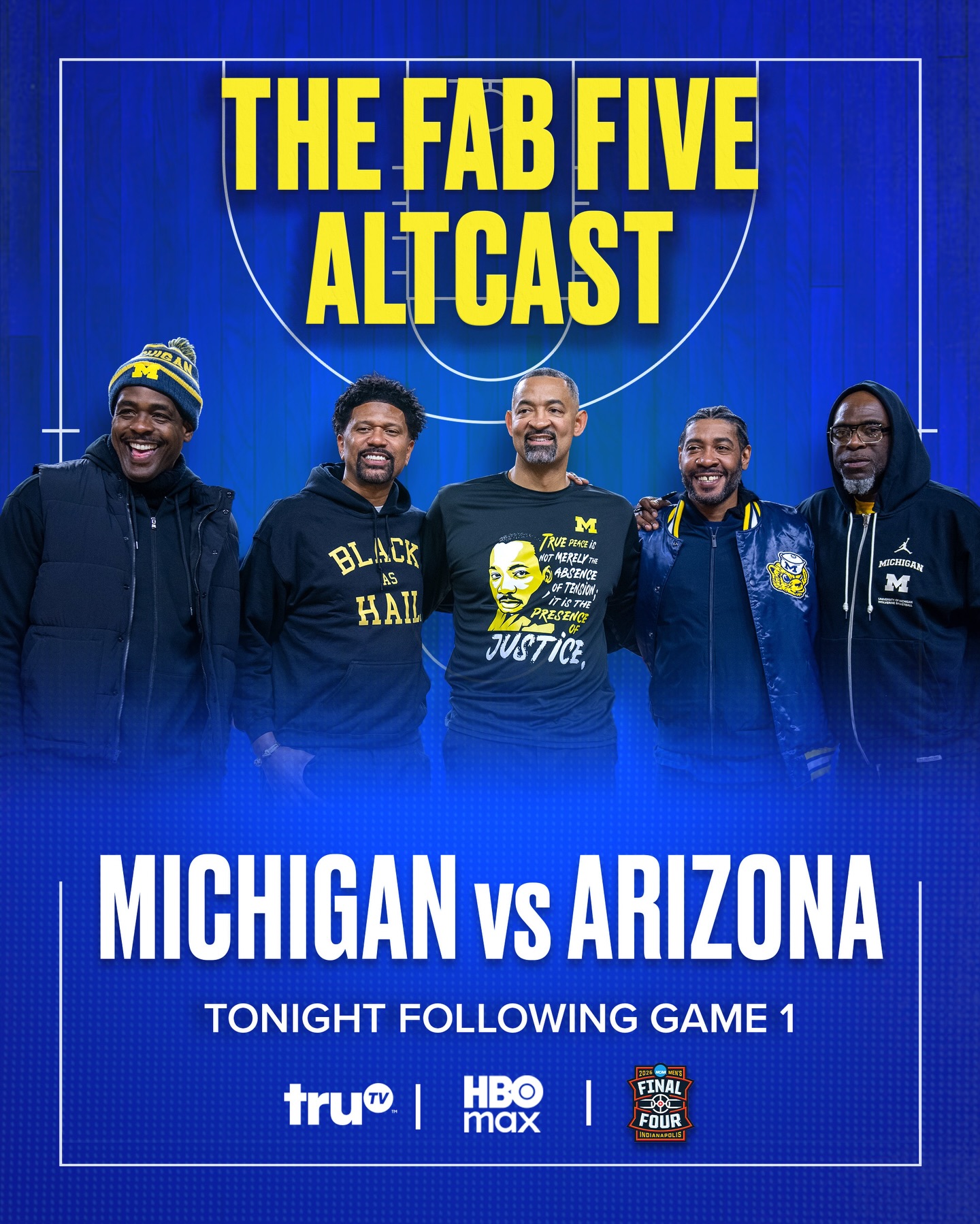 The guys made it to Indy! ๐ฅ Watch the Fab Five Altcast TONIGHT during Michigan vs Arizona following Game 1 on truTV & HBO Max! #MFinalFour
