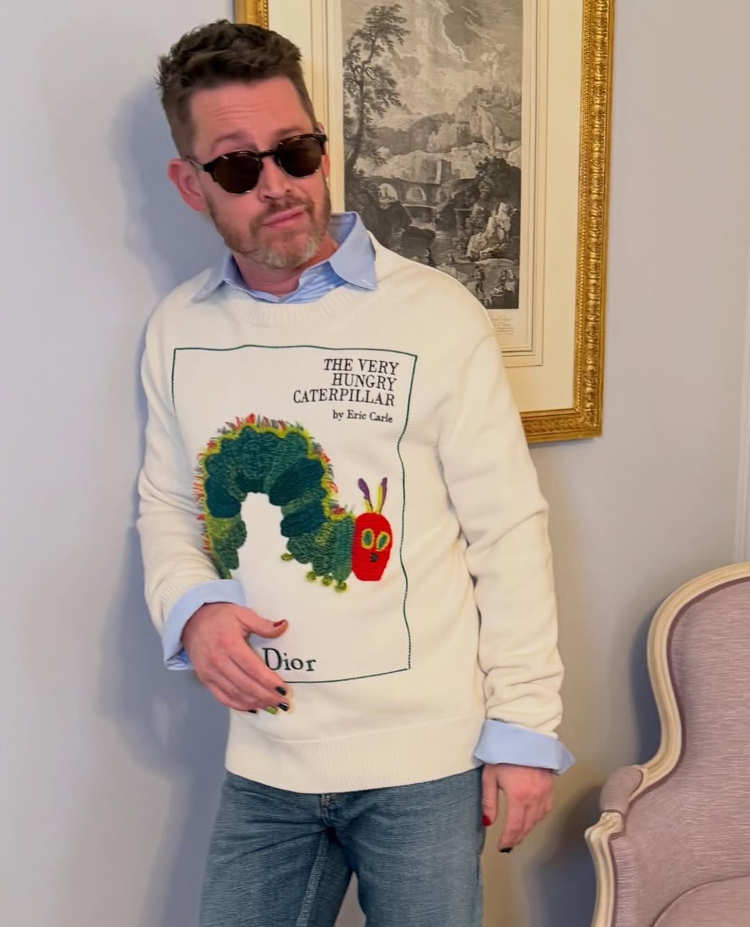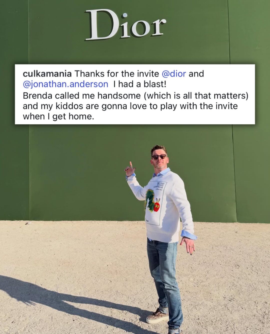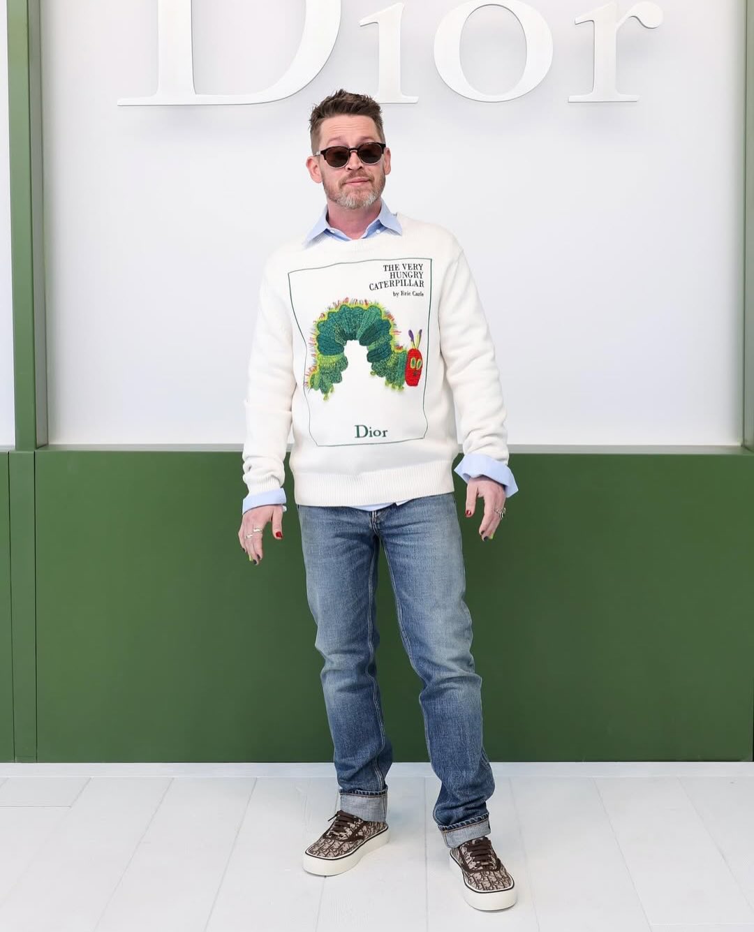 The actor sat front row at the Dior Fall 2026 show wearing a playful “Very Hungry Caterpillar” sweater, embracing a nostalgic and laid-back vibe. 🐛