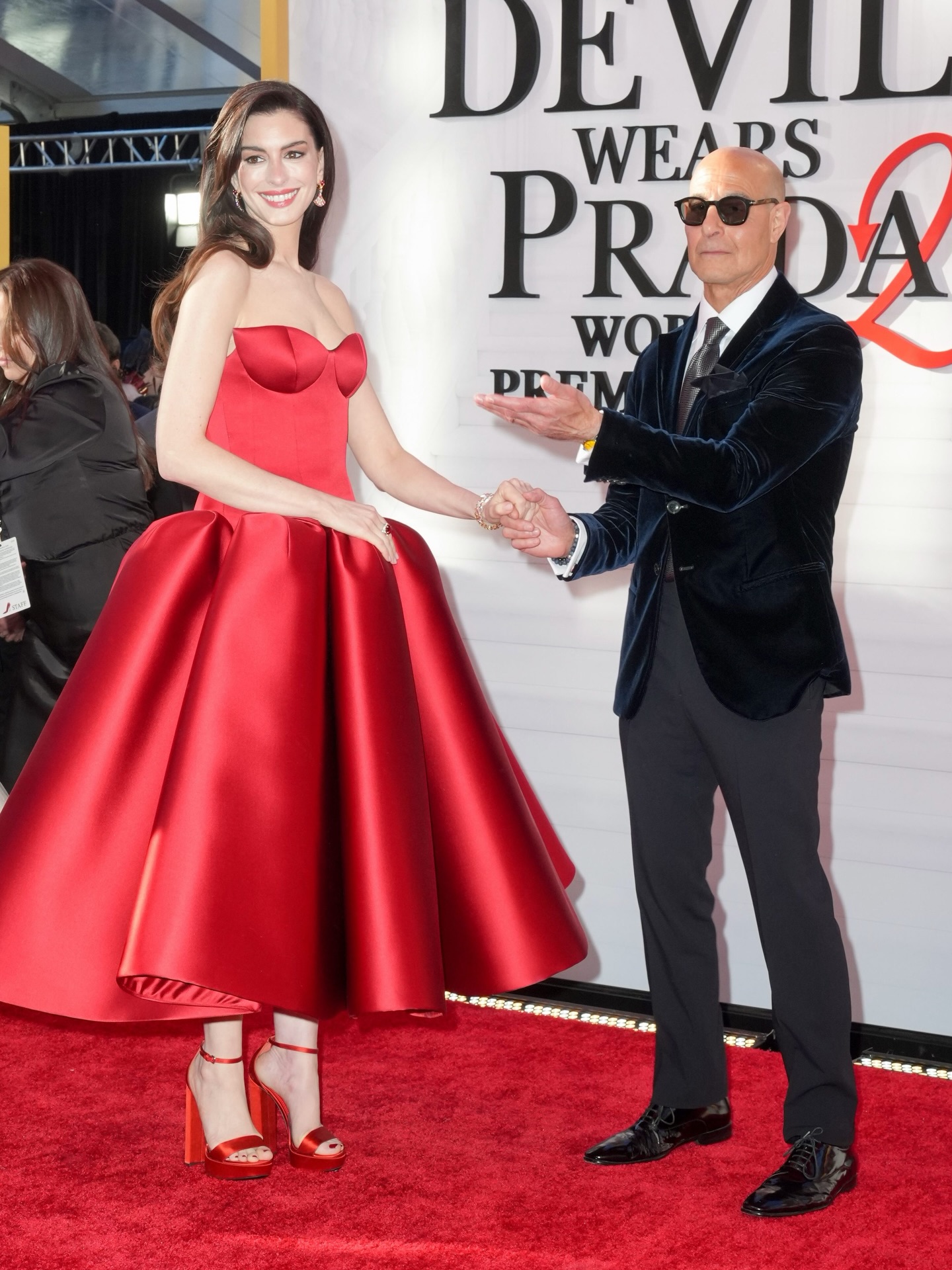 Andy Sachs is all grown up. @annehathaway arrives to the world premiere of ‘The Devil Wears Prada 2‘ in a strapless red silk bustier @louisvuitton gown.