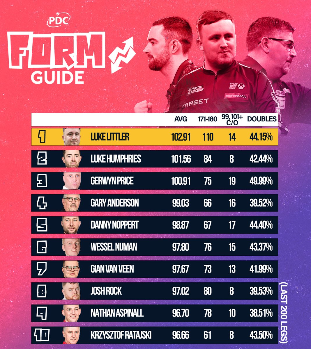 ๐ FORM GUIDE! PDC Stats Analyst Christopher Kempf assesses the top ten PDC stars - based on their last 200 legs played - following Night One of the Premier League and the first two Players Championship events of 2026. ๐ pdc.tv/news/2026/february/12/t