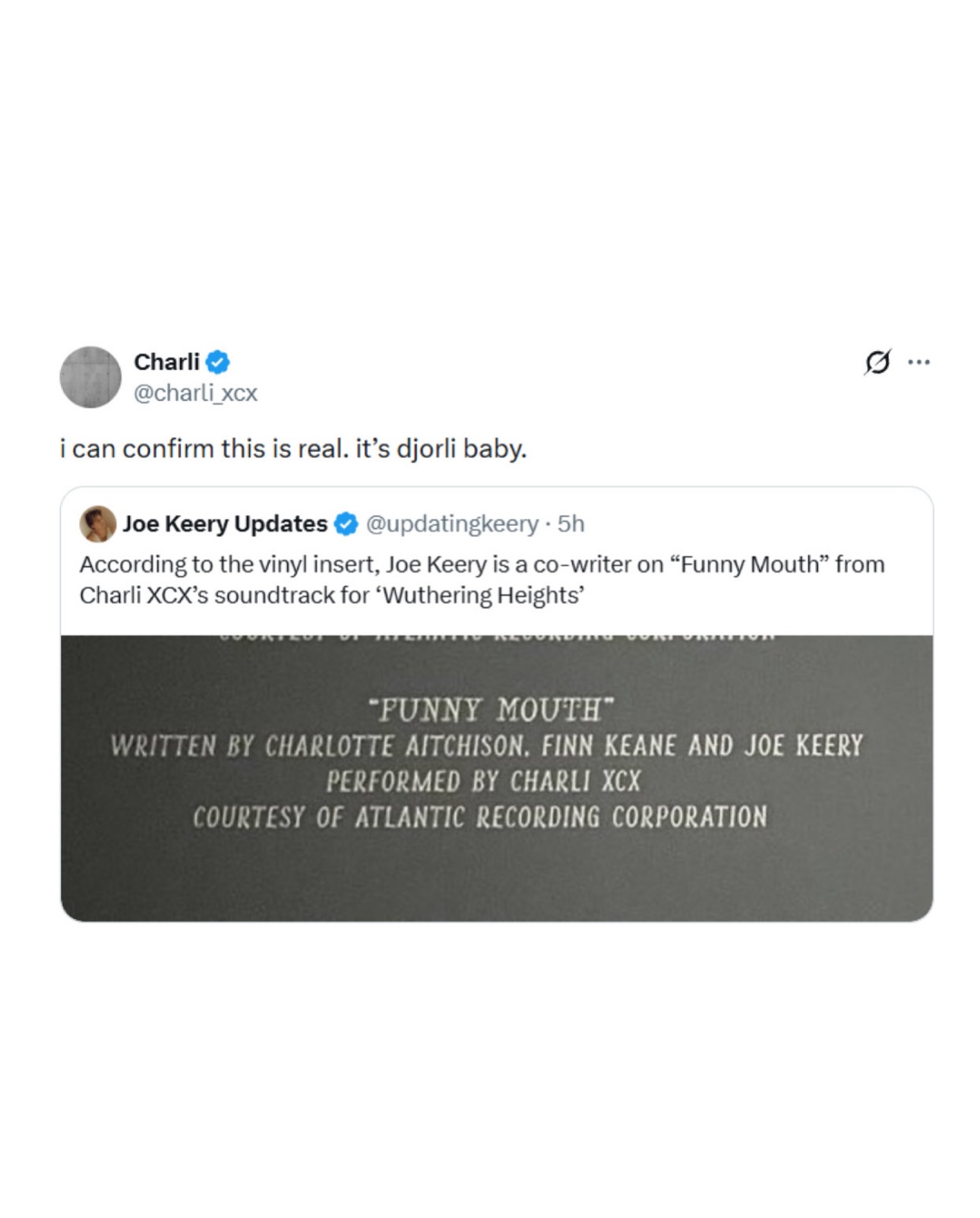 Fans clocked a surprise in the Wuthering Heights credits 👀 Joe Keery is listed as a co-writer on Charli xcx’s “Funny Mouth.”