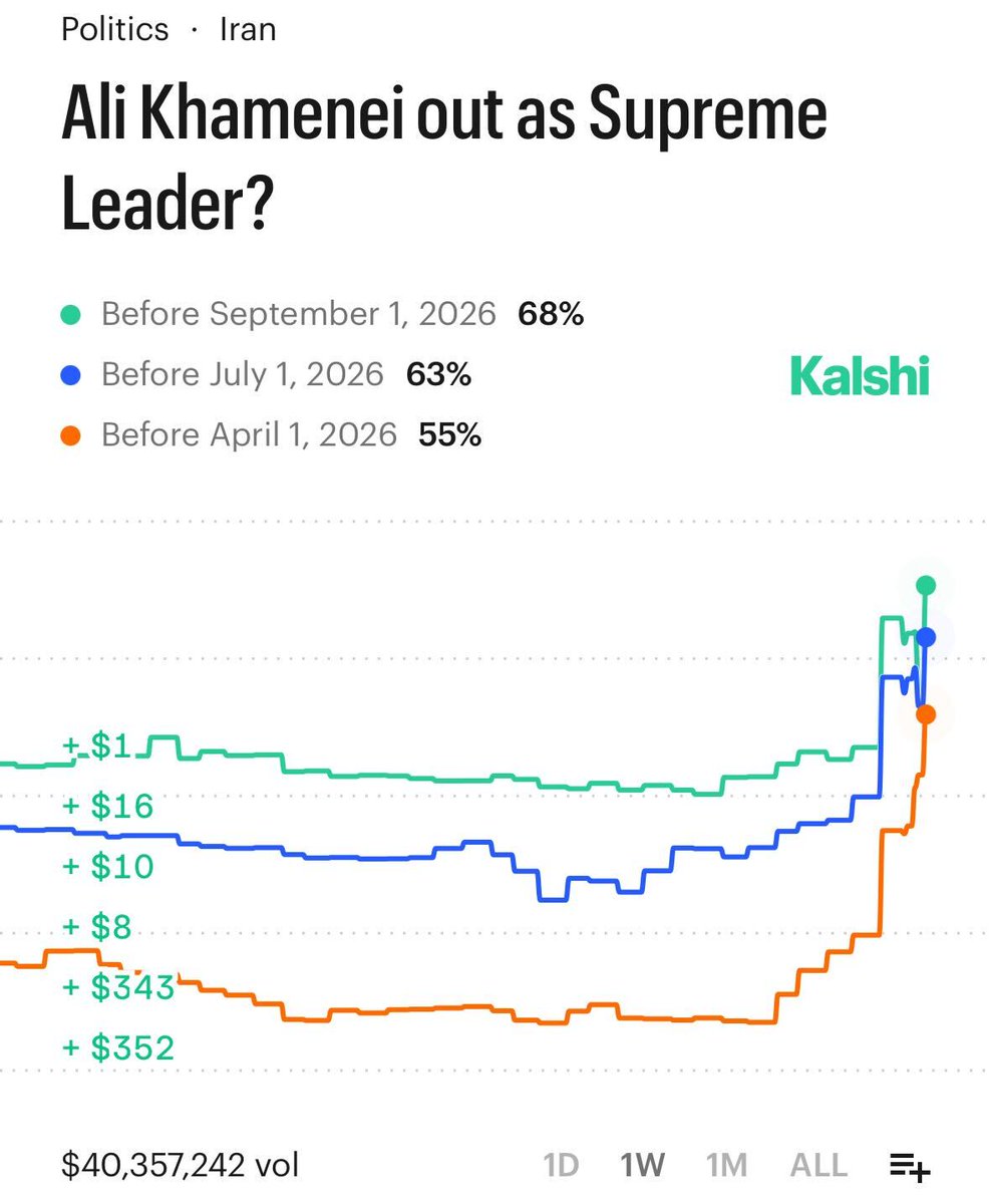 BREAKING: The odds Ali Khamenei is out as Supreme Leader have surged to 68% Reminder: Kalshi does not offer markets that settle on death. If Ali Khamenei dies, the market will resolve based on the last traded price prior to confirmed reporting of death.