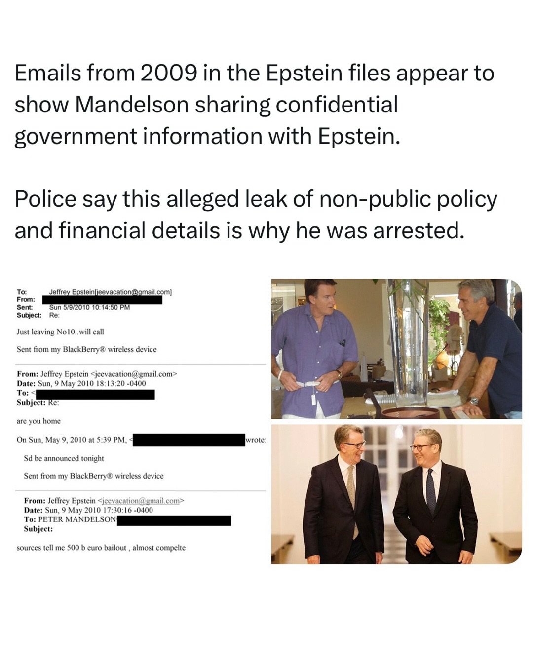 Peter Mandelson was detained by police after the U.S. Justice Department released millions of documents linked to Jeffrey Epstein, some of which appear to show Mandelson sharing sensitive political and market information with Epstein.