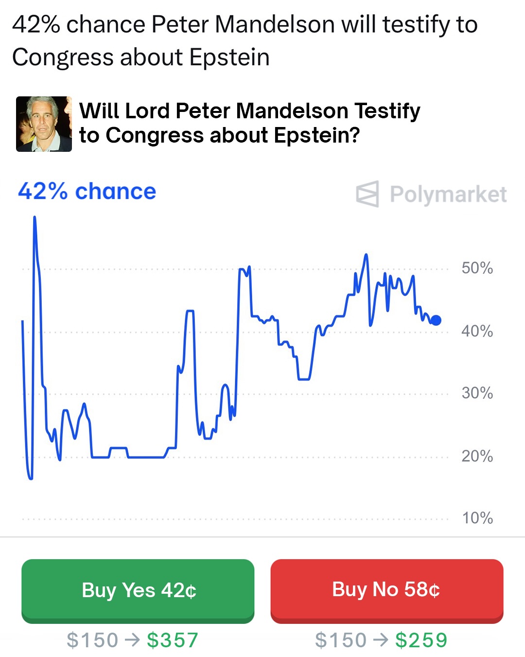 Traders predict a 50% chance Mandelson will be charged by the end of March.