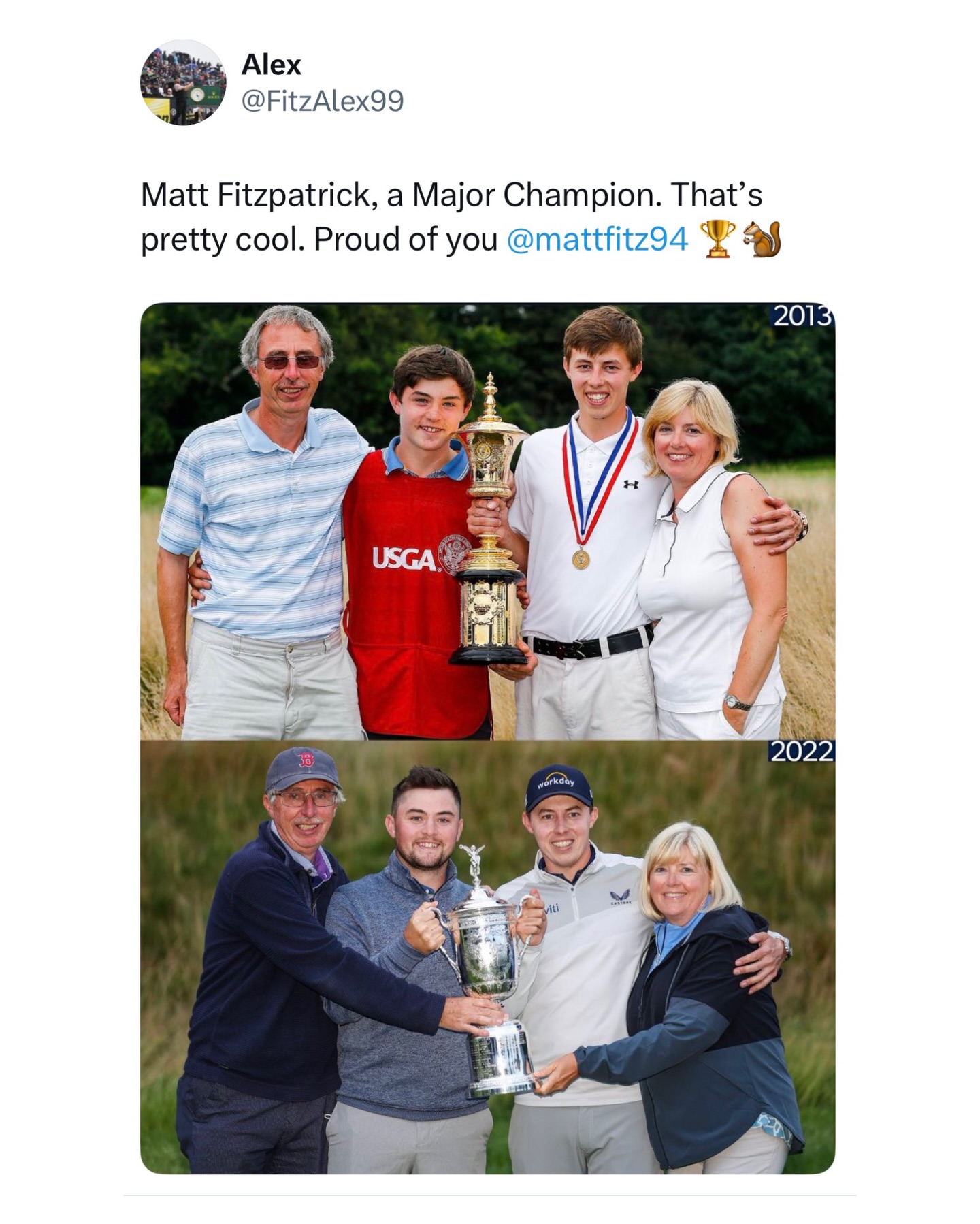 Matty Fitz showing love to his brother Alex after his first DP World Tour win, with the same tweet Alex posted after his U.S. Open win. So awesome.