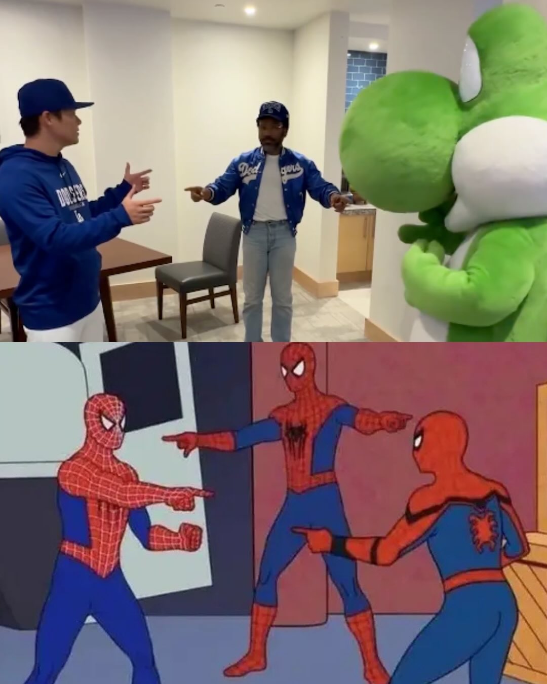 Donald Glover, who voices Yoshi in the new Super Mario Galaxy movie, Yoshi, and Yoshinobu Yamamoto (aka Yoshi) recreated the iconic Spider-Man meme at the Dodgers game.