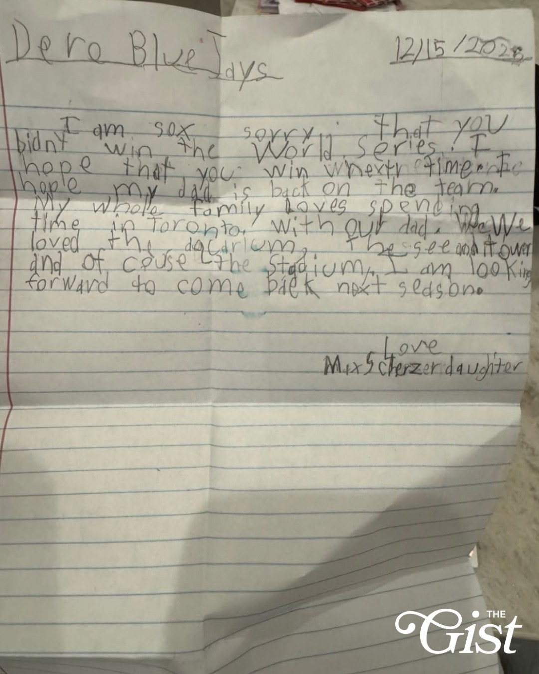 “I am so sorry that you didn’t win the World Series… I hope my dad is back on the team… We loved the aquarium, CN Tower and of course, the stadium.” 🏟️