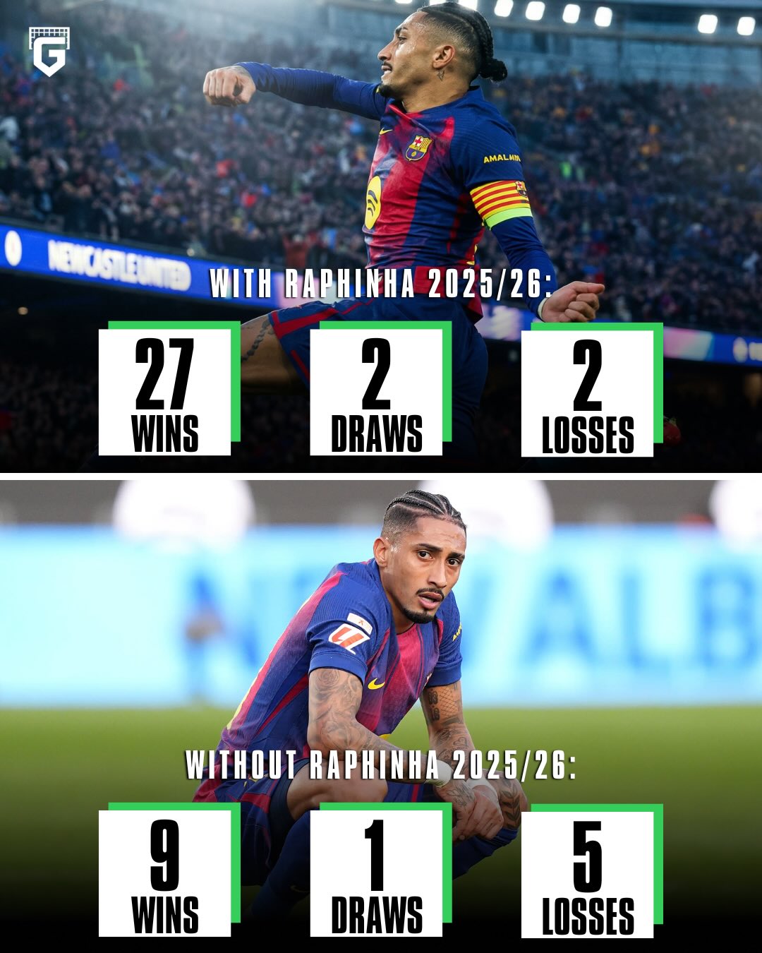 Without Raphinha this season, Barça have lost 33% of their games 👀