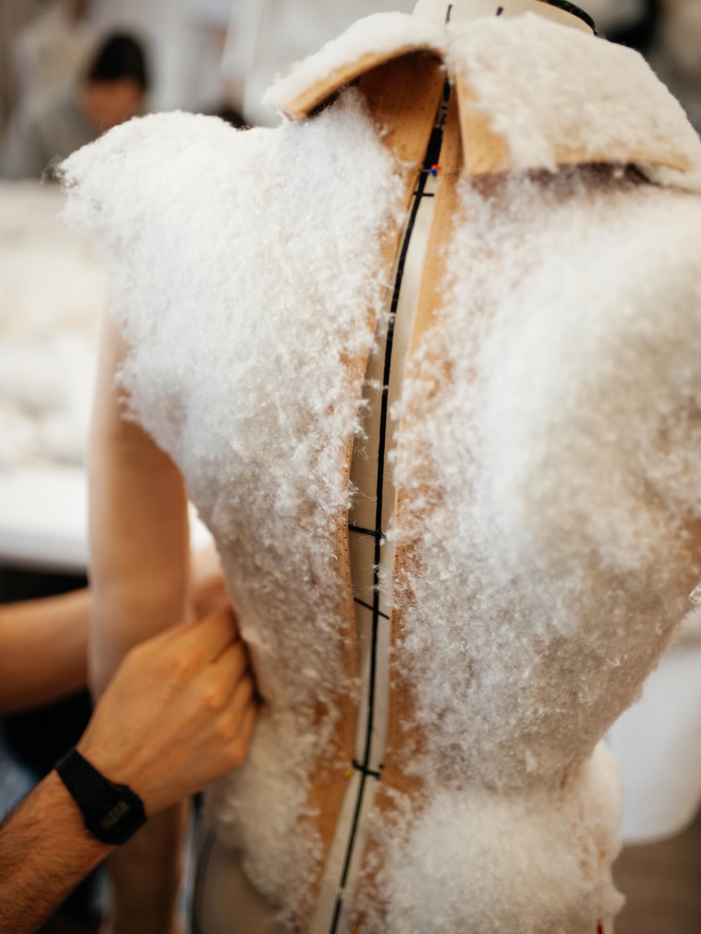 Look 9 worn by Lulu and Zendaya is a single-breasted tailored jacket in nude corset toile covered with a play of multiple layers of jersey and wadding to create a depth-effect, with molded hips and a matching pencil skirt.
