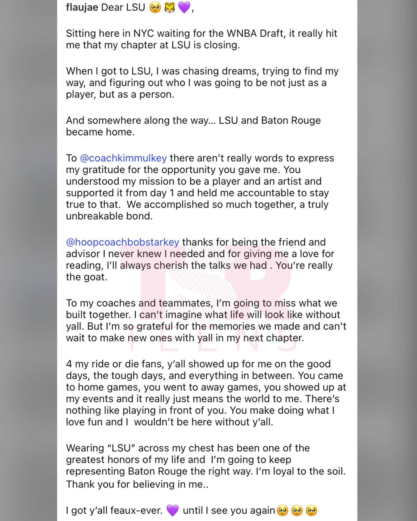 #Flaujae pens a heartfelt message thanking her coaches, teammates, and supporters while reflecting on her time playing women’s basketball at #LSU, as she prepares for the WNBA Draft 💜🏀 (SWIPE) 📸: @gettyimages ✍🏽: #TSRStaffKH