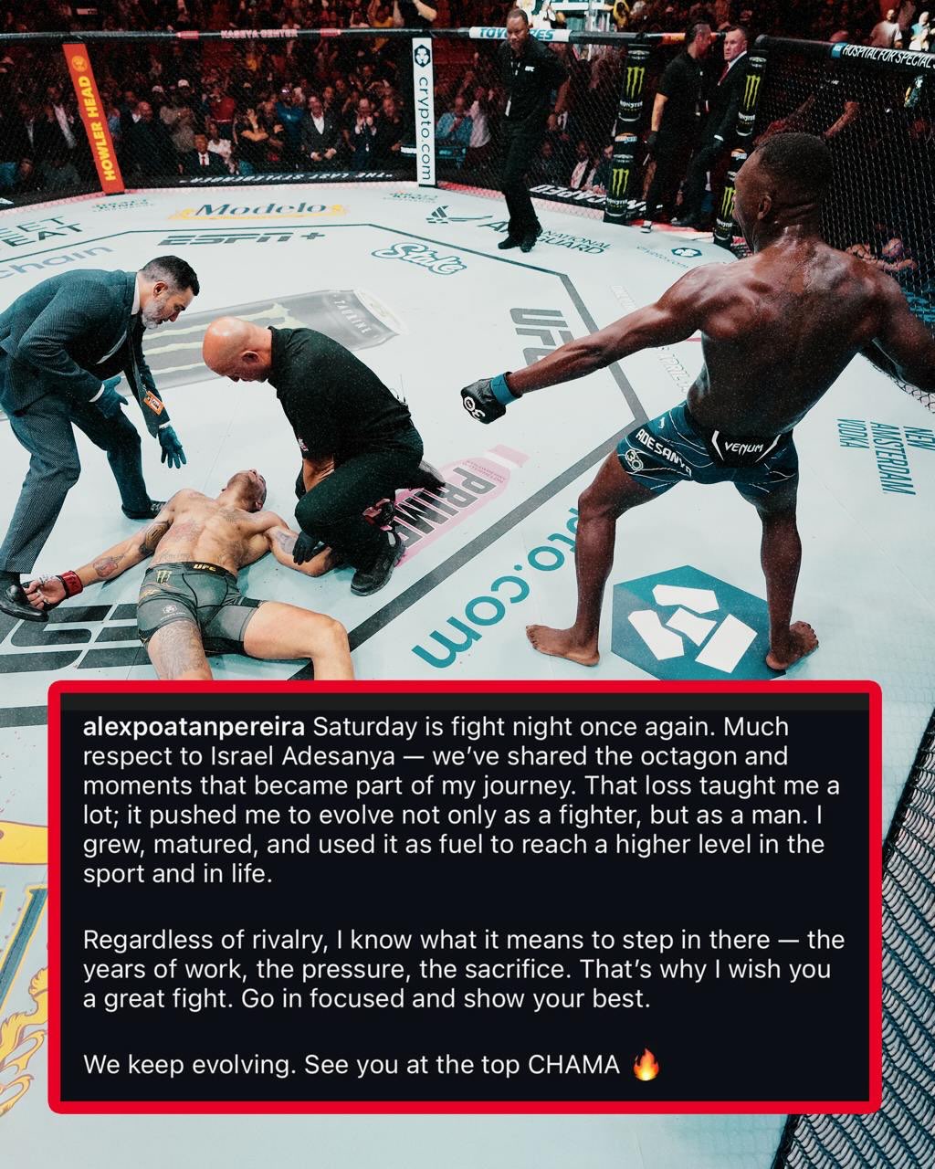 Alex Pereira has sent a message to Israel Adesanya ahead of his bout with Joe Pyfer this weekend, offering words of respect and perspective. Pereira reflected on their rivalry, acknowledging how their fights pushed both men to evolve and ultimately helped shape them into elite fighters.