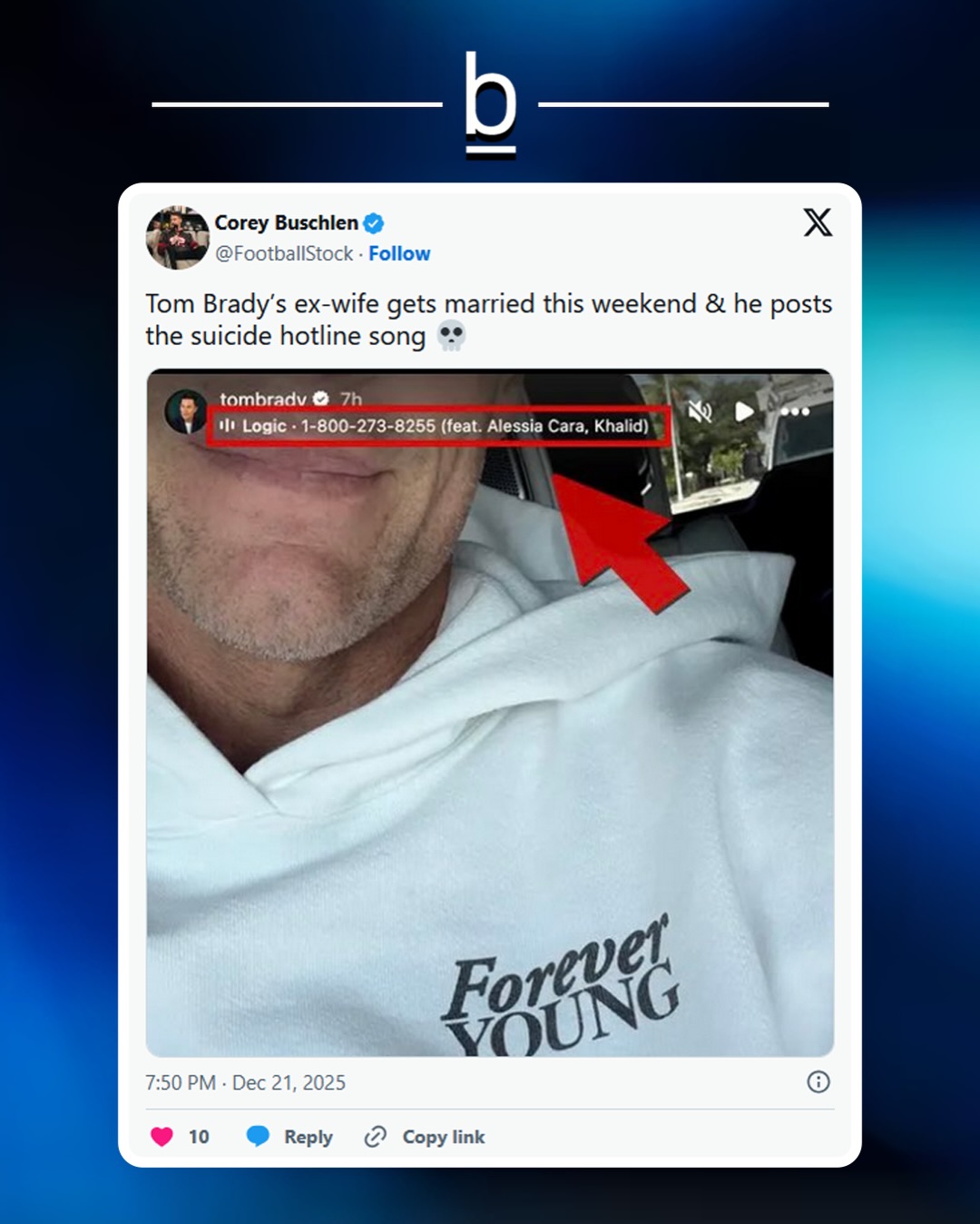 In two separate posts over the weekend, following news that his ex-wife Gisele Bundchen had gotten remarried, Brady posted stories alongside “1-800-273-8255,” the 2017 suicide prevention song by the rapper Logic. 💿