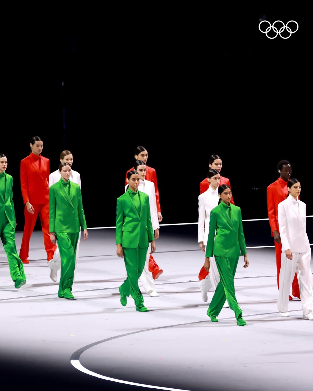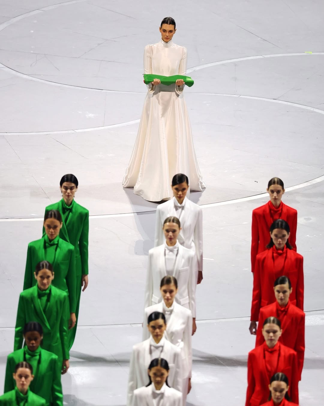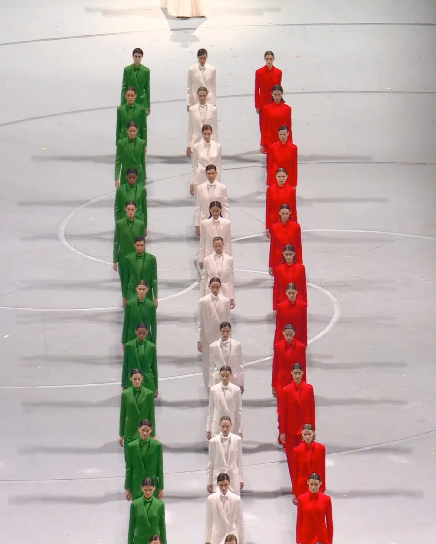 The stadium lights up in green, white, and red as custom Armani suits take center stage. Three runways, three groups of models, one celebration of Italian elegance. @vittoria serves as the flag bearer for the opening ceremony.