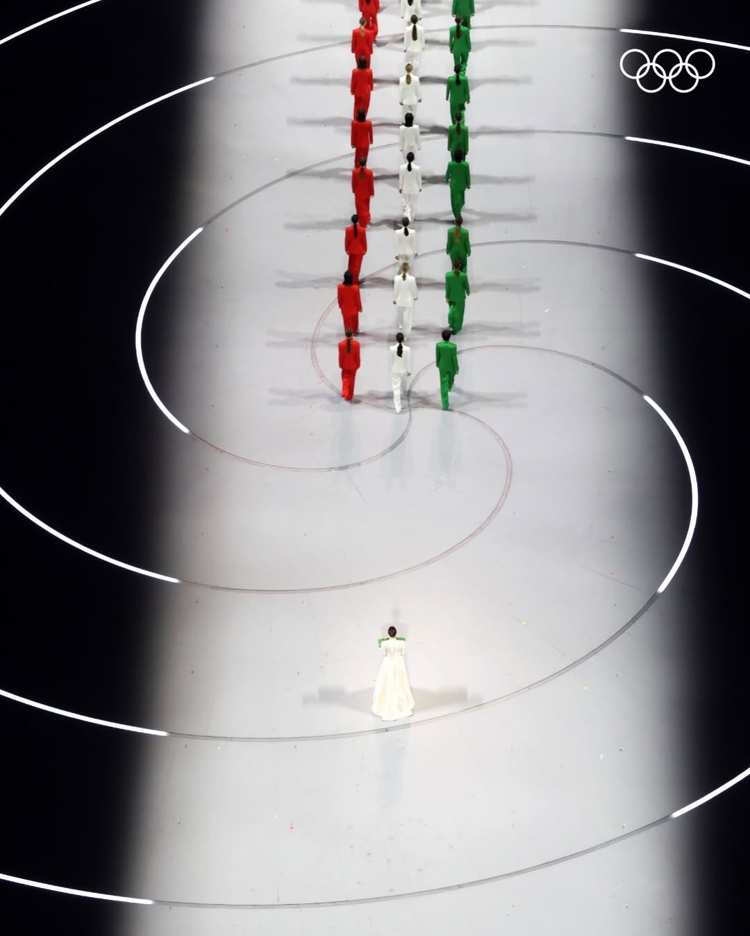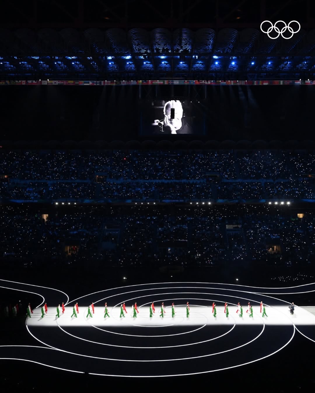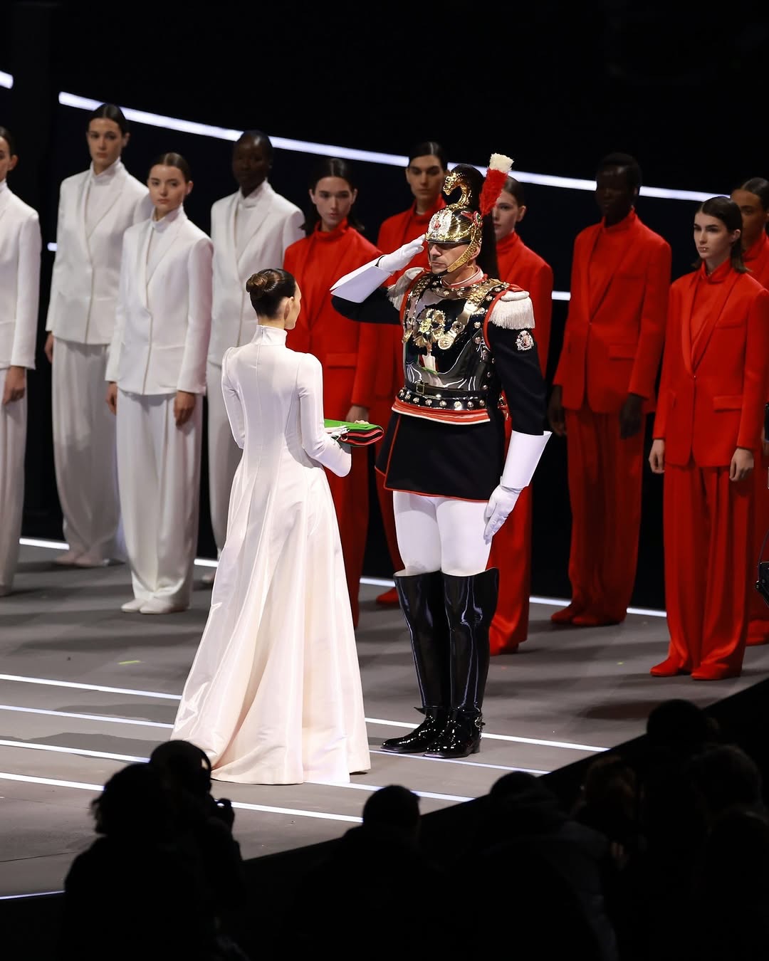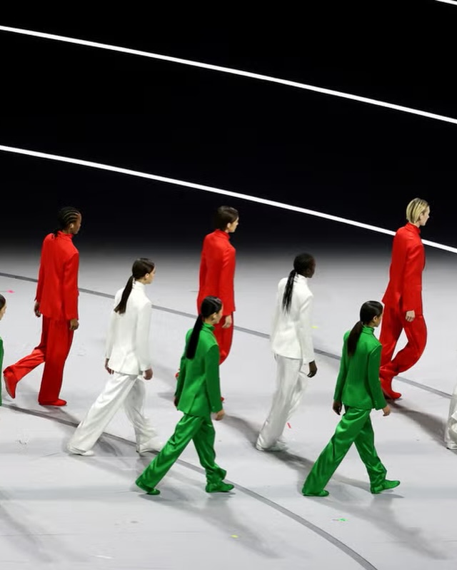 The stadium lights up in green, white, and red as custom Armani suits take center stage. Three runways, three groups of models, one celebration of Italian elegance. @vittoria serves as the flag bearer for the opening ceremony.
