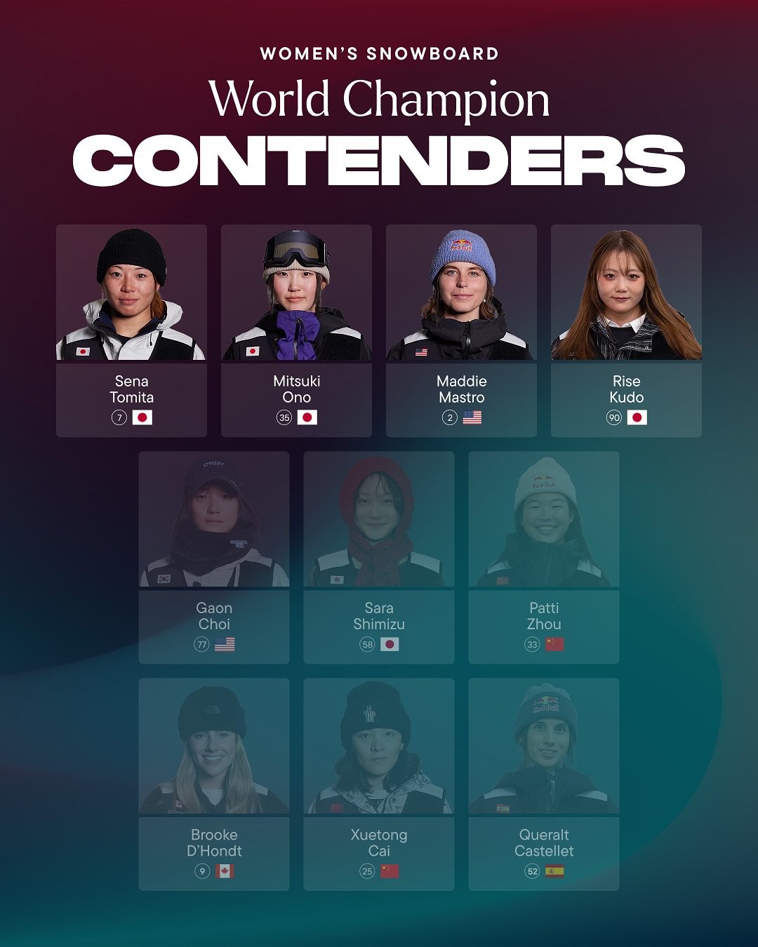 Heading into the last event of the season, these are the final Snowboard athletes that can take home the World Championship title.