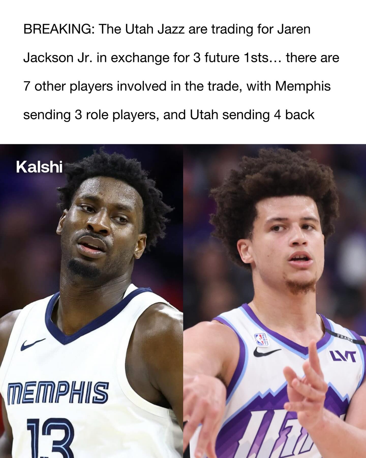 The Grizzlies are trading Jaren Jackson Jr., John Konchar, Jock Landale and Vince Williams Jr. to the Utah Jazz for Walter Clayton Jr., Kyle Anderson, Taylor Hendricks, Georges Niang and three future first-round picks, per @ShamsCharania