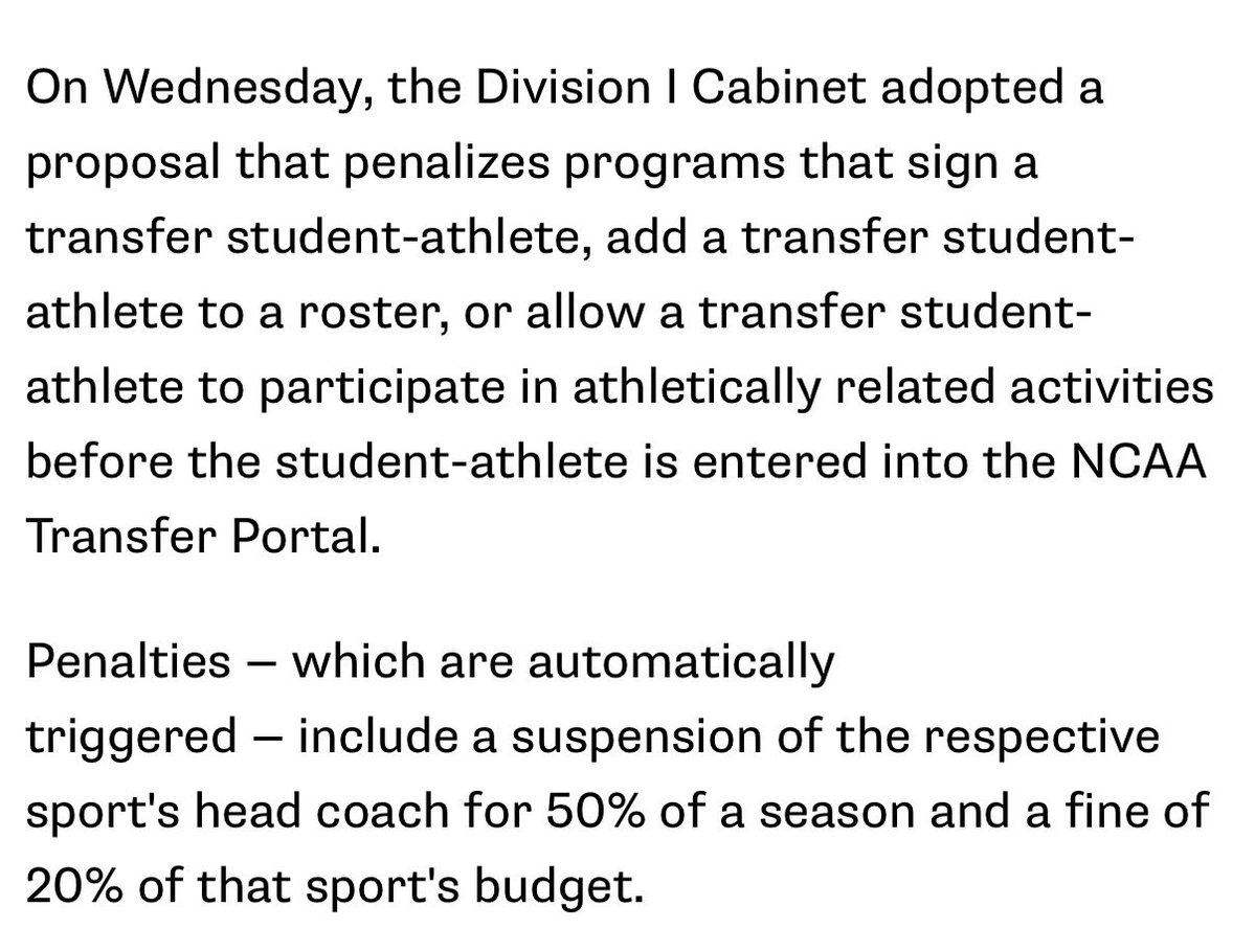 It’s now official that teams will be punished if they add a player who didn’t enter the transfer portal during the January window. The penalties approved today by the Division I cabinet: