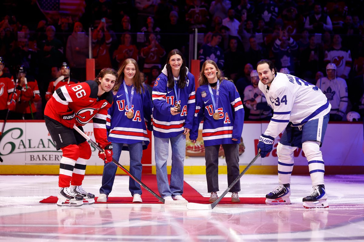Olympic gold medalists Aerin Frankel, Megan Keller and Haley Winn dropped the puck ahead of tonight's game between the @NJDevils and @MapleLeafs with Jack Hughes and Auston Matthews taking the draw! 🥇