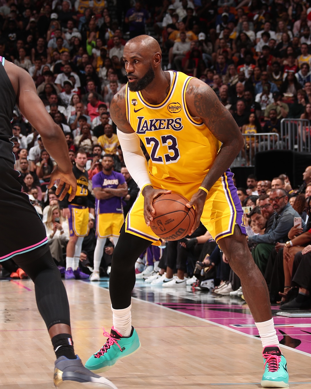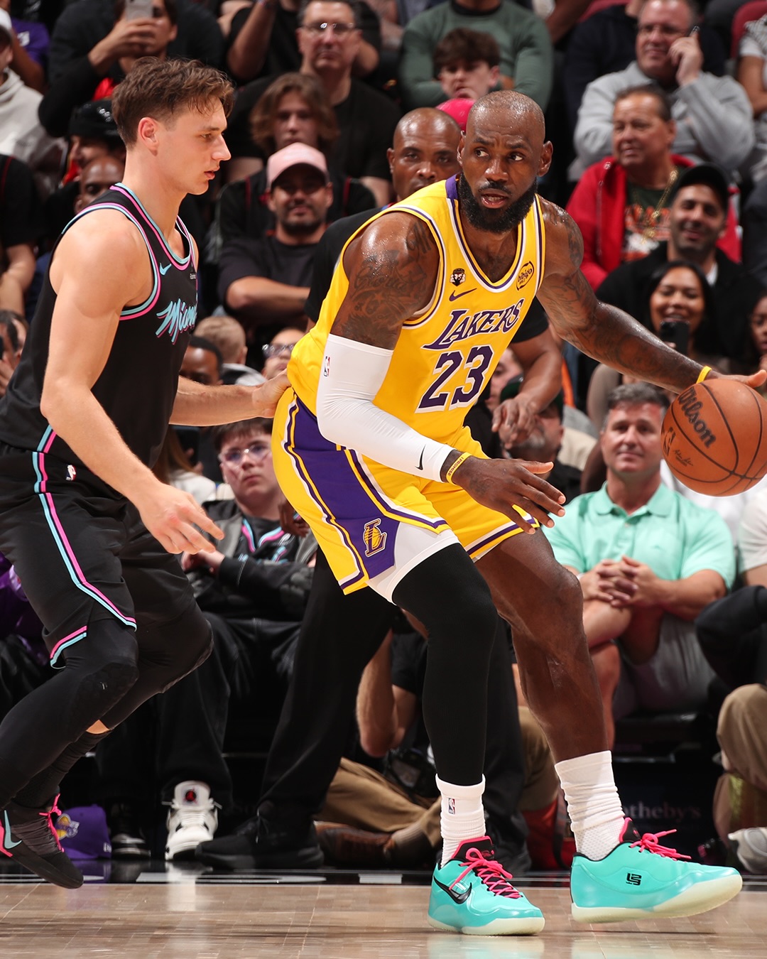LeBron James debuts a “South Beach” colorway of the Nike LeBron 23 during tonight’s game against the Heat in South Beach, recording a triple-double stat line in the road win against his former team.
