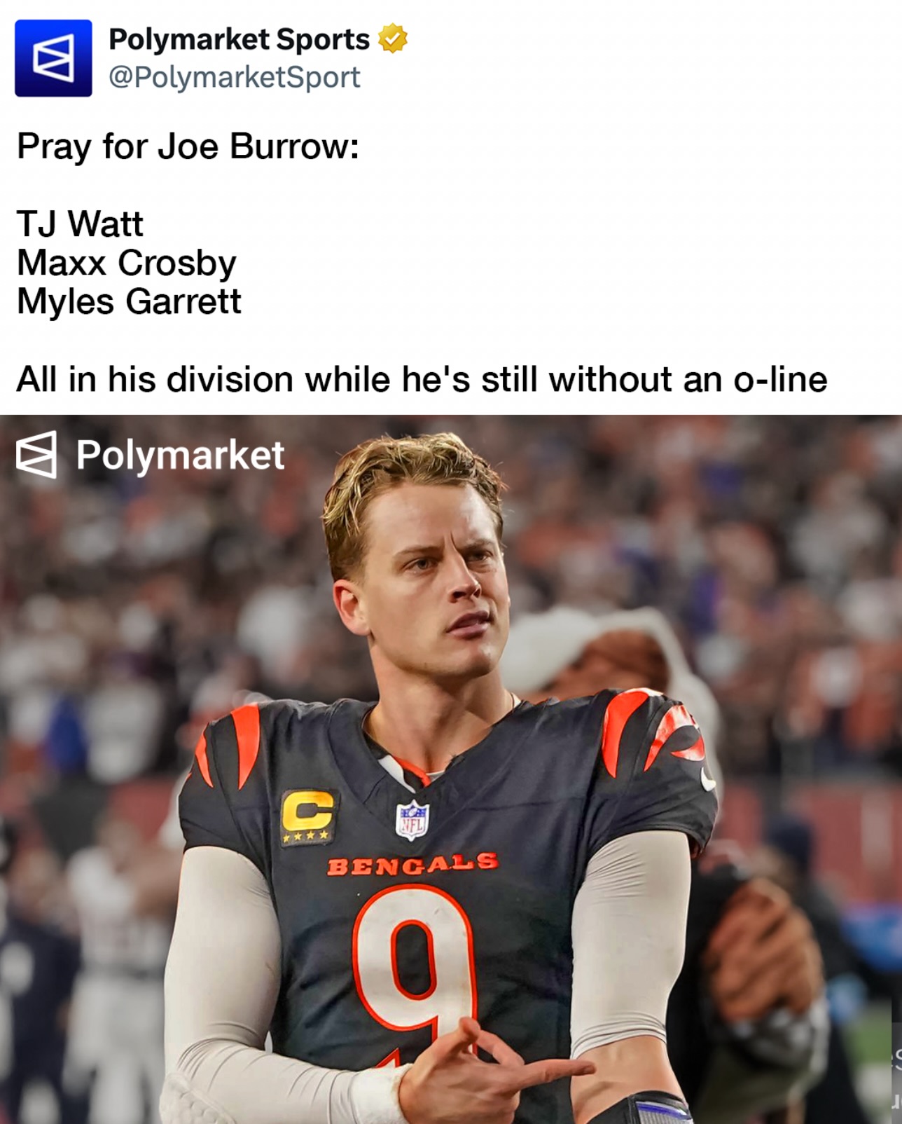 Pray for Joe Burrow: TJ Watt, Myles Garrett, Maxx Crosby all in his division… He’s in hell