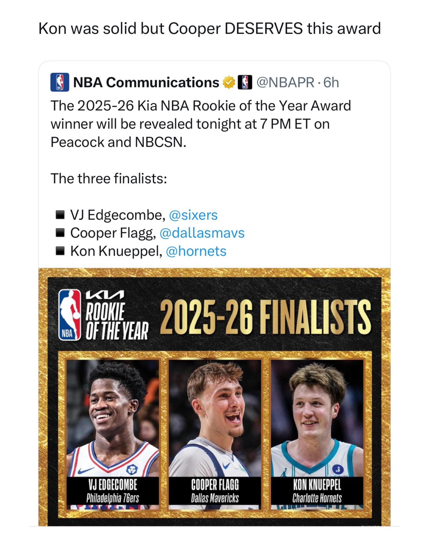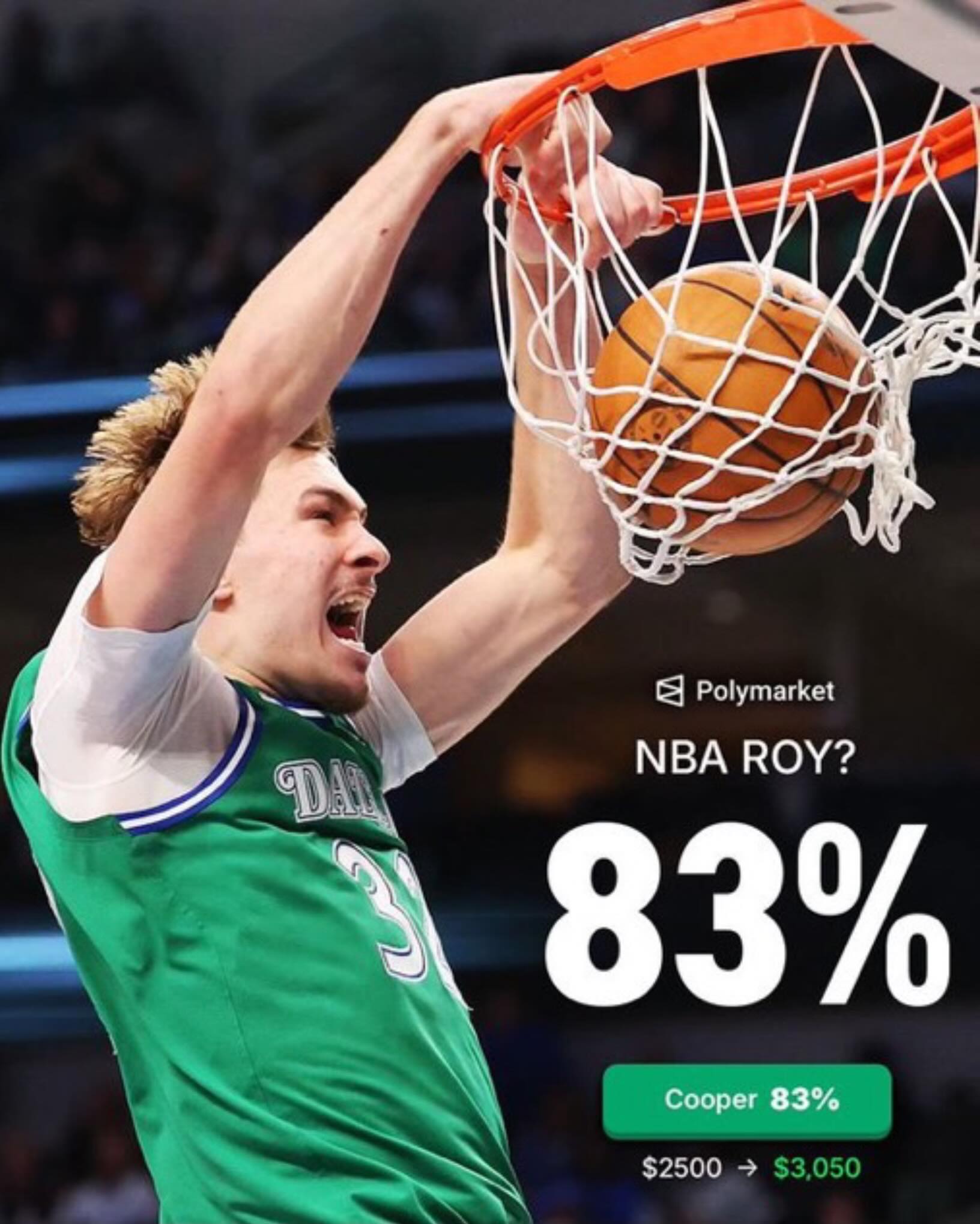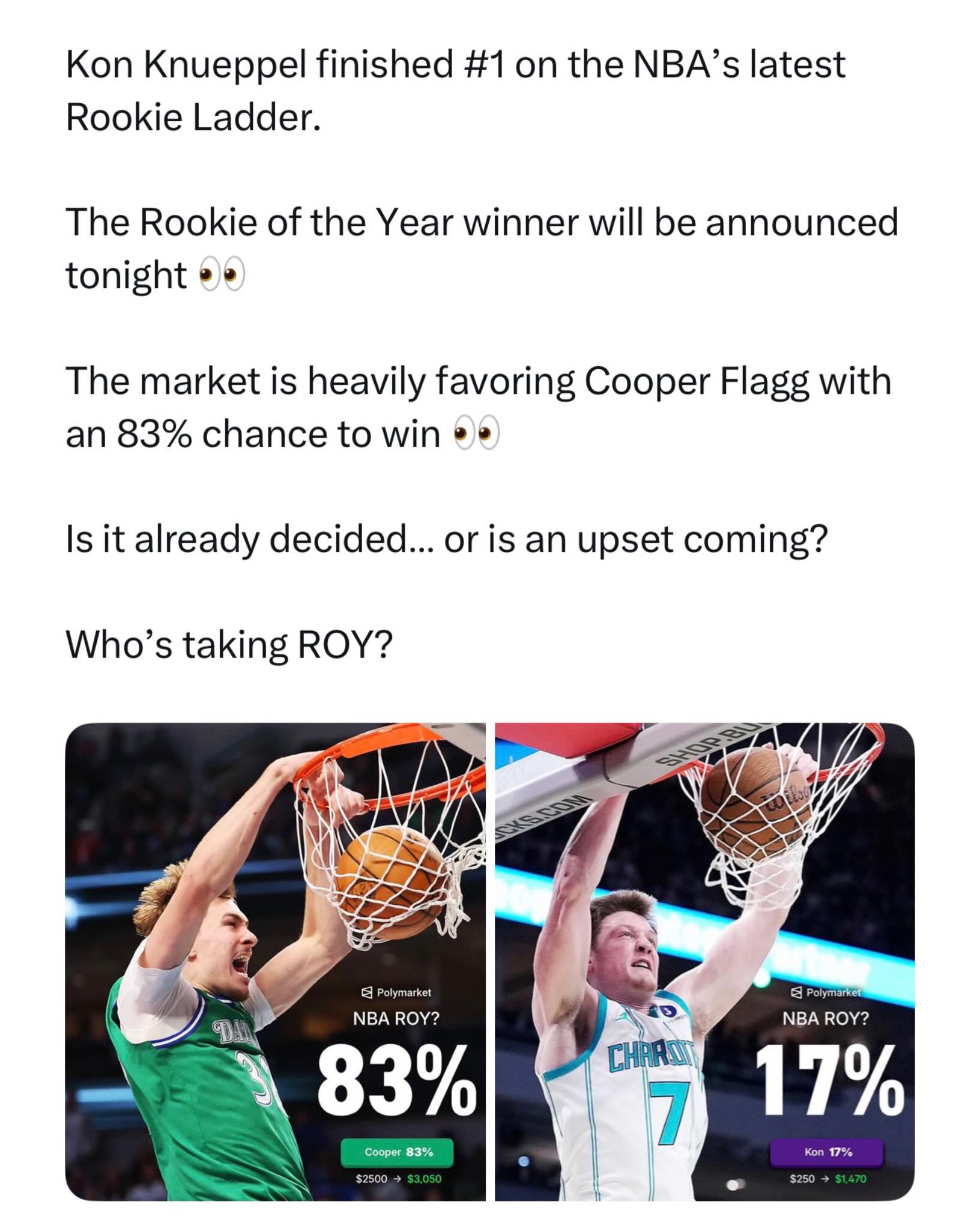 Who wins the ROTY tonight? π Cooper Flagg now has an 83% chance to win the award. Polymarket is giving away $20 free with code HOOPSNATION π
