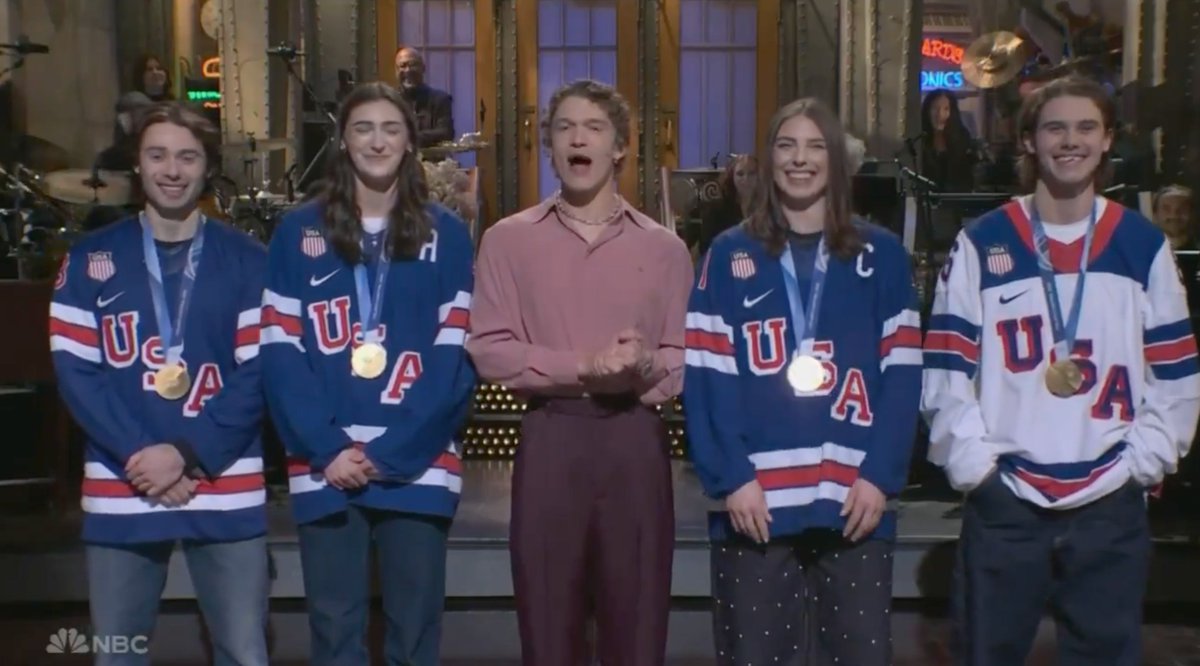 ๐บ๐ธ Quinn Hughes ๐บ๐ธ Megan Keller ๐บ๐ธ Hilary Knight ๐บ๐ธ Jack Hughes Team USA hockey gold medalists joined Heated Rivalry star Connor Storrie on Saturday Night Live ๐ฅ