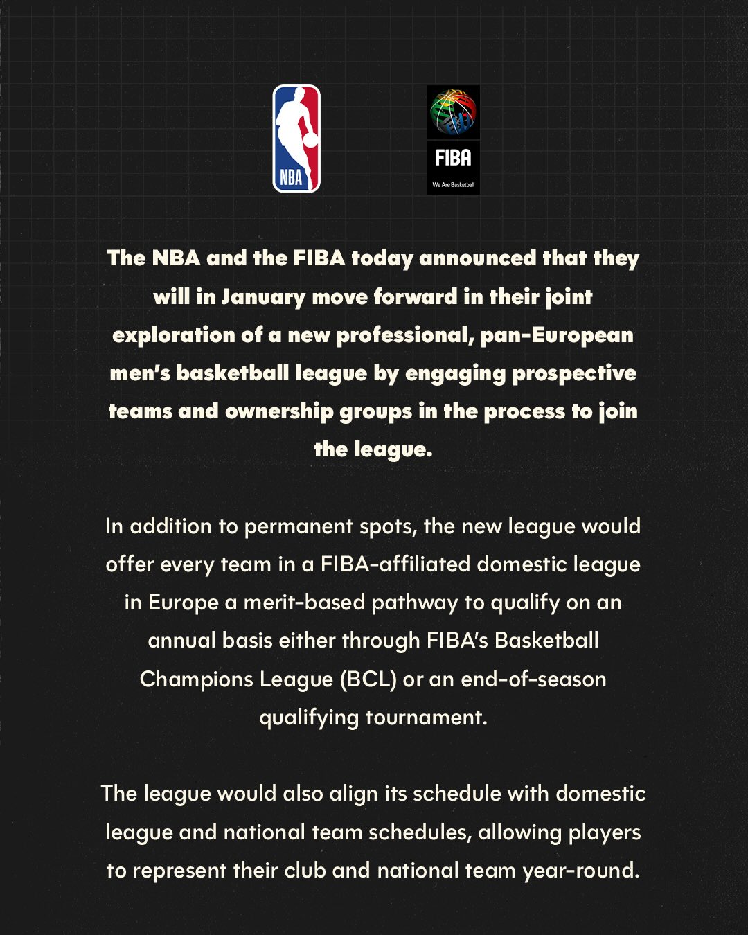 The National Basketball Association (NBA) and the International Basketball Federation (@FIBA) today announced that they will in January move forward in their joint exploration of a new professional, pan-European men’s basketball league by engaging prospective teams and ownership groups in the process to join the league.