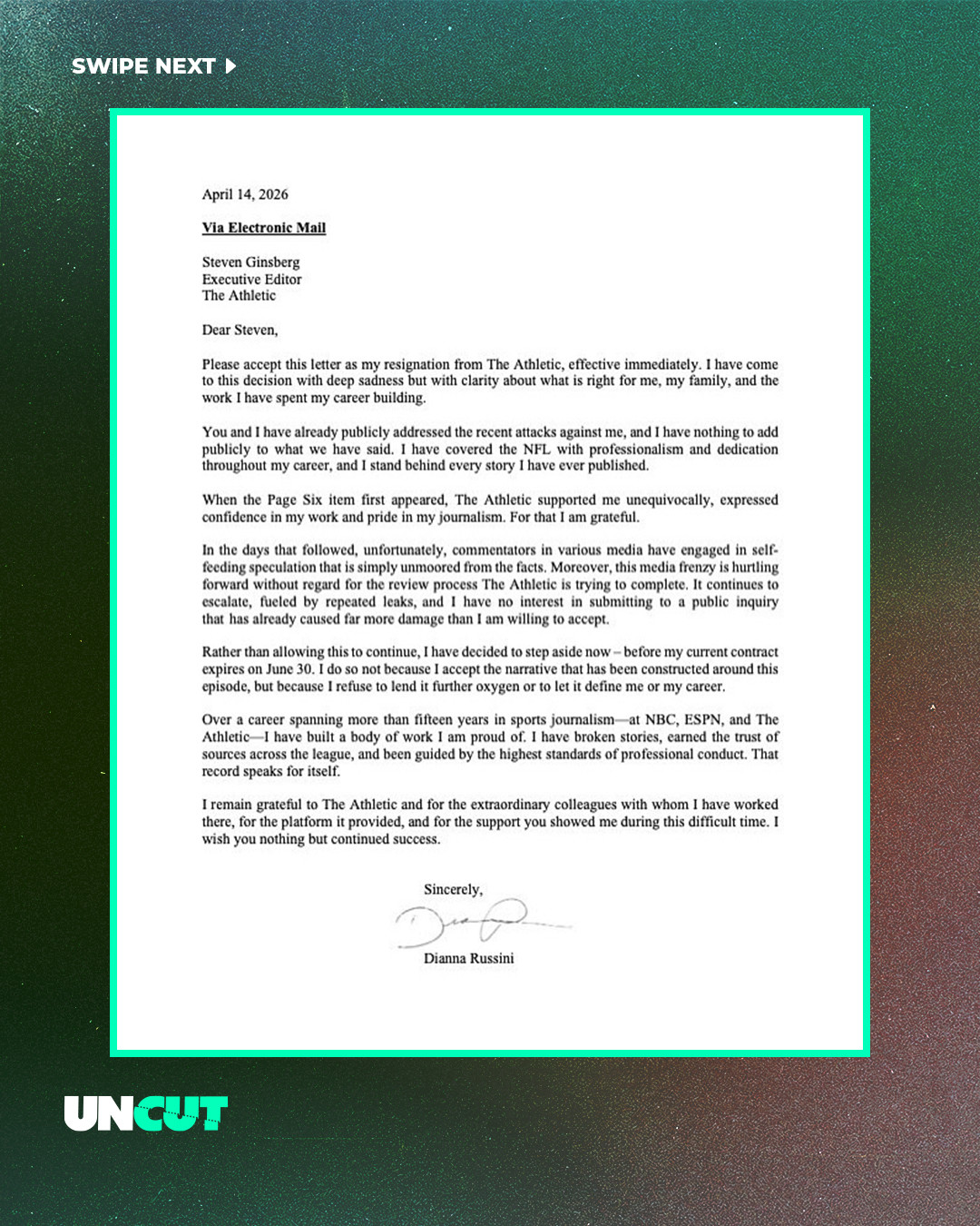 The images sparked an internal review, and Russini later said she chose to resign to stop the growing speculation, emphasizing she stands by her work and doesn’t want the situation to define her career 🏈