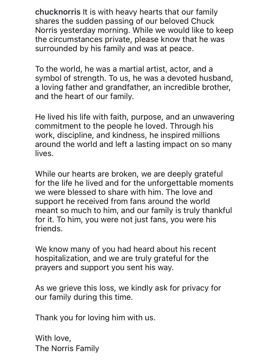 The legendary action star passed after being hospitalized for a medical emergency in Hawaii. Norris’ family confirmed his death via Instagram, and thanked fans for their love and support.
