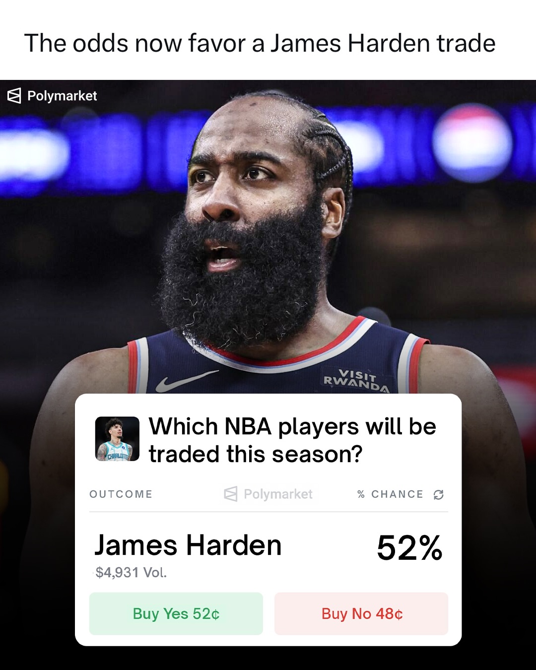 Harden’s odds of being traded have skyrocketed to 52% on Polymarket 📈