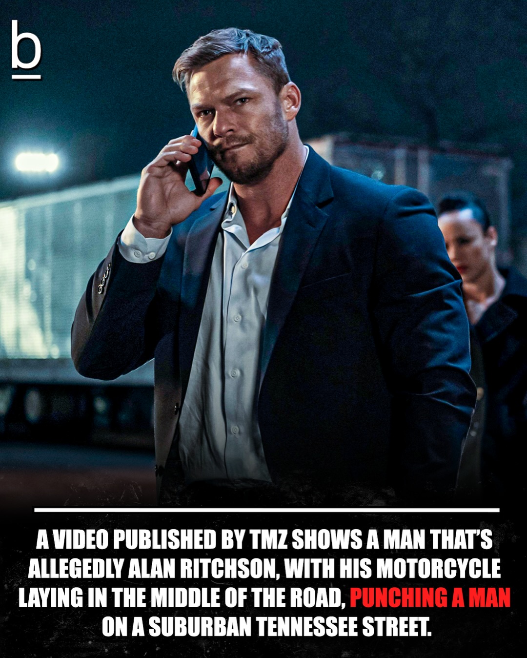 Video published by TMZ shows a man that’s allegedly Reacher star Alan Ritchson, with his motorcycle laying in the middle of the road, punching a man on a suburban Tennessee street.