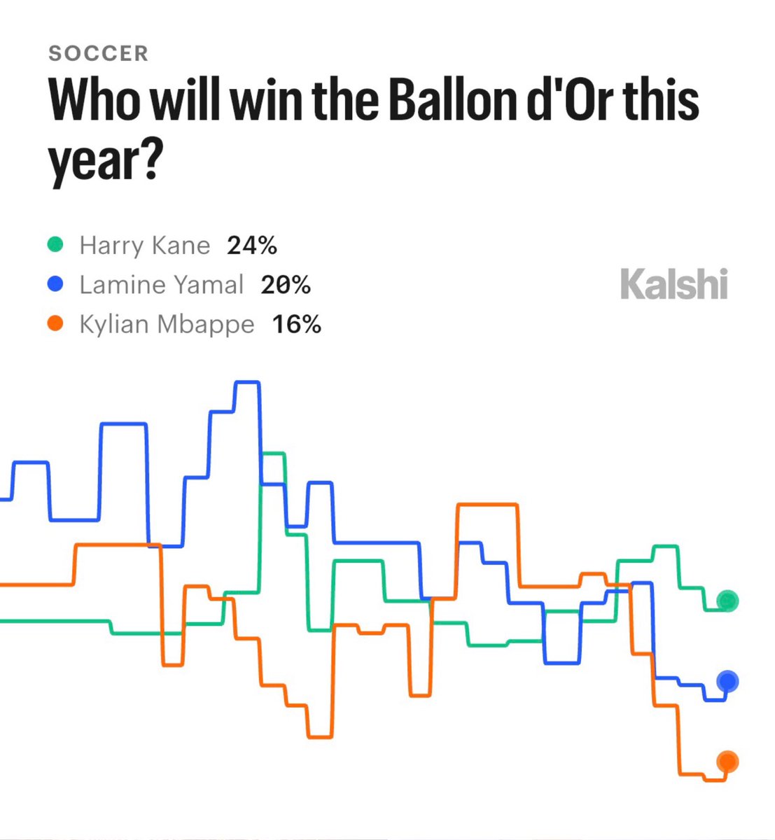 Favorites to win this year’s Ballon d’Or, via Kalshi: 24% — Harry Kane 20% — Lamine Yamal 16% — Kylian Mbappe 9% — Michael Olise 7% — Declan Rice 6% — Vitinha 3% — Bruno Fernandez 3% — Erling Haaland 3% — Vinicius Junior 2% — Jude Bellingham 2% — Raphinha 2% — Phil Foden