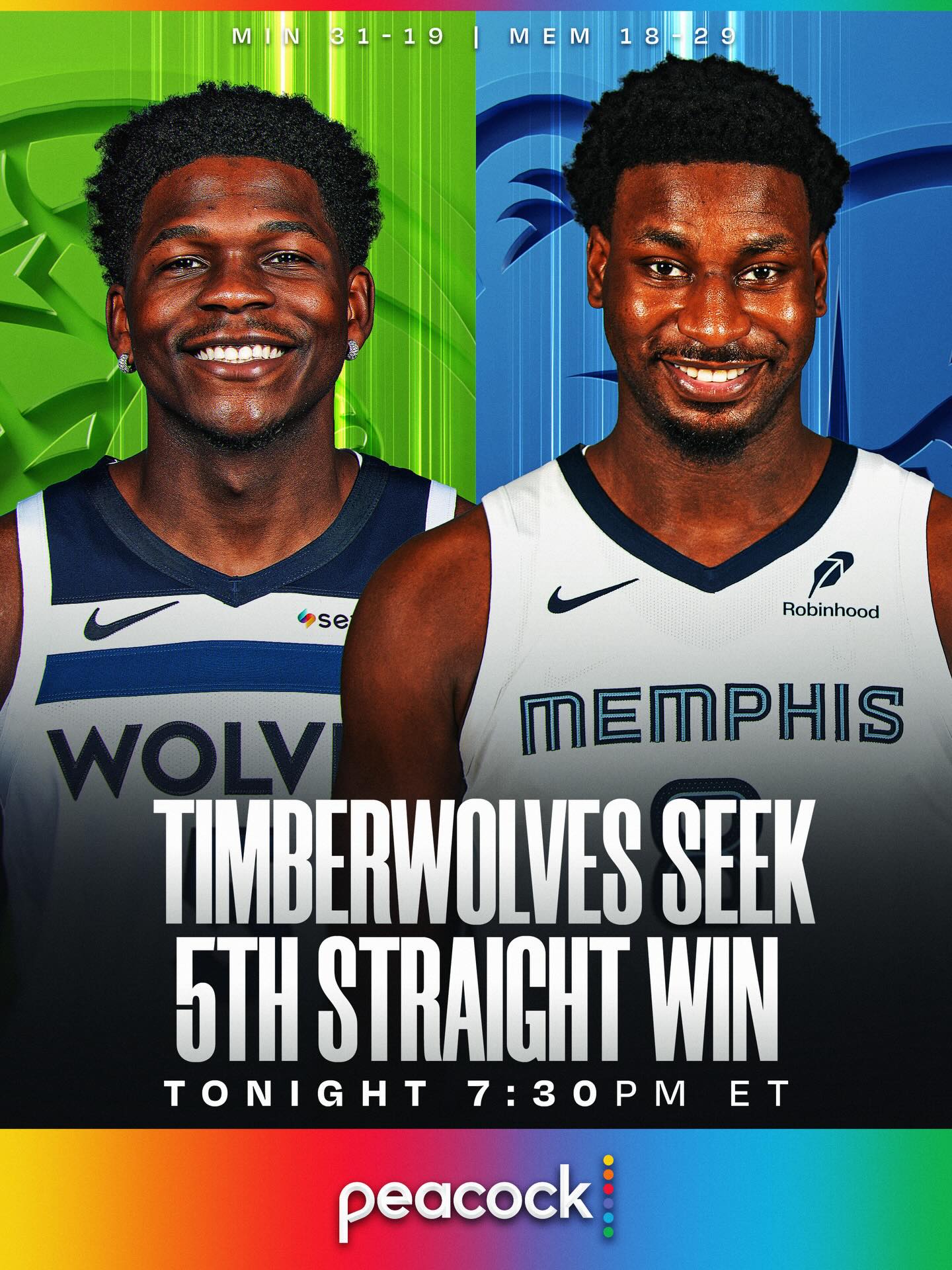 ANT, WOLVES SEEK 5 STRAIGHT 🔥 Anthony Edwards (29.4 PPG, 3rd in NBA) and the West #5 @timberwolves visit Jaren Jackson Jr. (19.0 PPG, 1.5 BPG) and the @memgrizz. Action tips off at 7:30pm/et on @peacock!