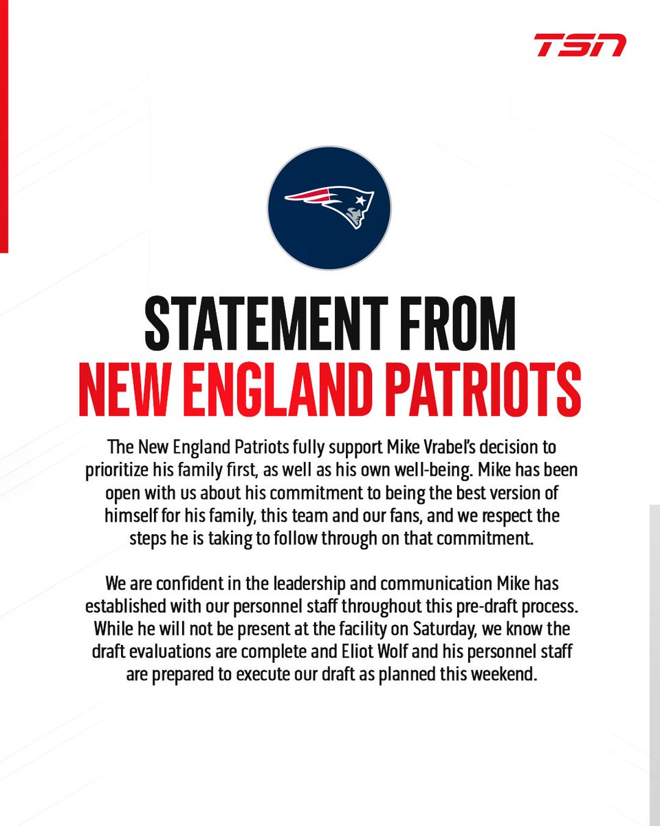 The New England Patriots have released a statement following HC Mike Vrabel stating that he will be receiving counselling and will miss Day 3 of the NFL Draft on Saturday.
