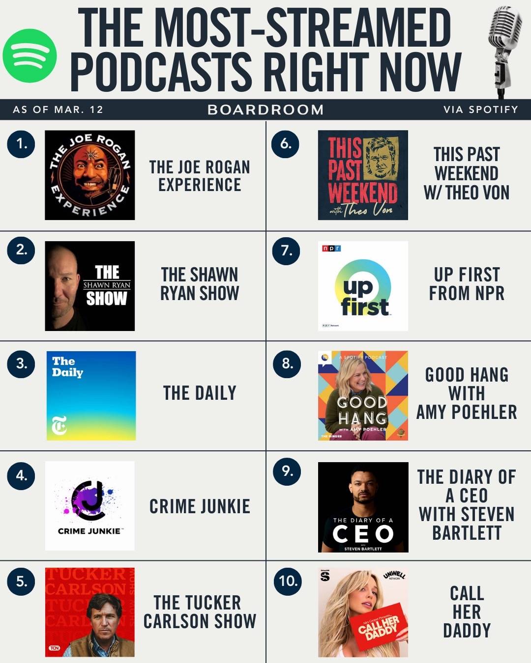 ‘The Joe Rogan Experience’ continues to dominate Spotify, holding its place as the platform’s top podcast. Recent interviews with professional boxer and four-time world champion Shakur Stevenson and actor, producer, entrepreneur and former Miss World Priyanka Chopra Jonas helped keep the show at No. 1. ‘The Daily’ from The New York Times also landed near the top of Spotify’s charts, with its latest run of episodes largely centered on the war in Iran, including breakdowns of the first 10 days of the conflict, the global oil market fallout, and the Anthropic vs. Pentagon battle over AI warfare. (via @Spotify) #top #podcasts #most #streamed #joerogan