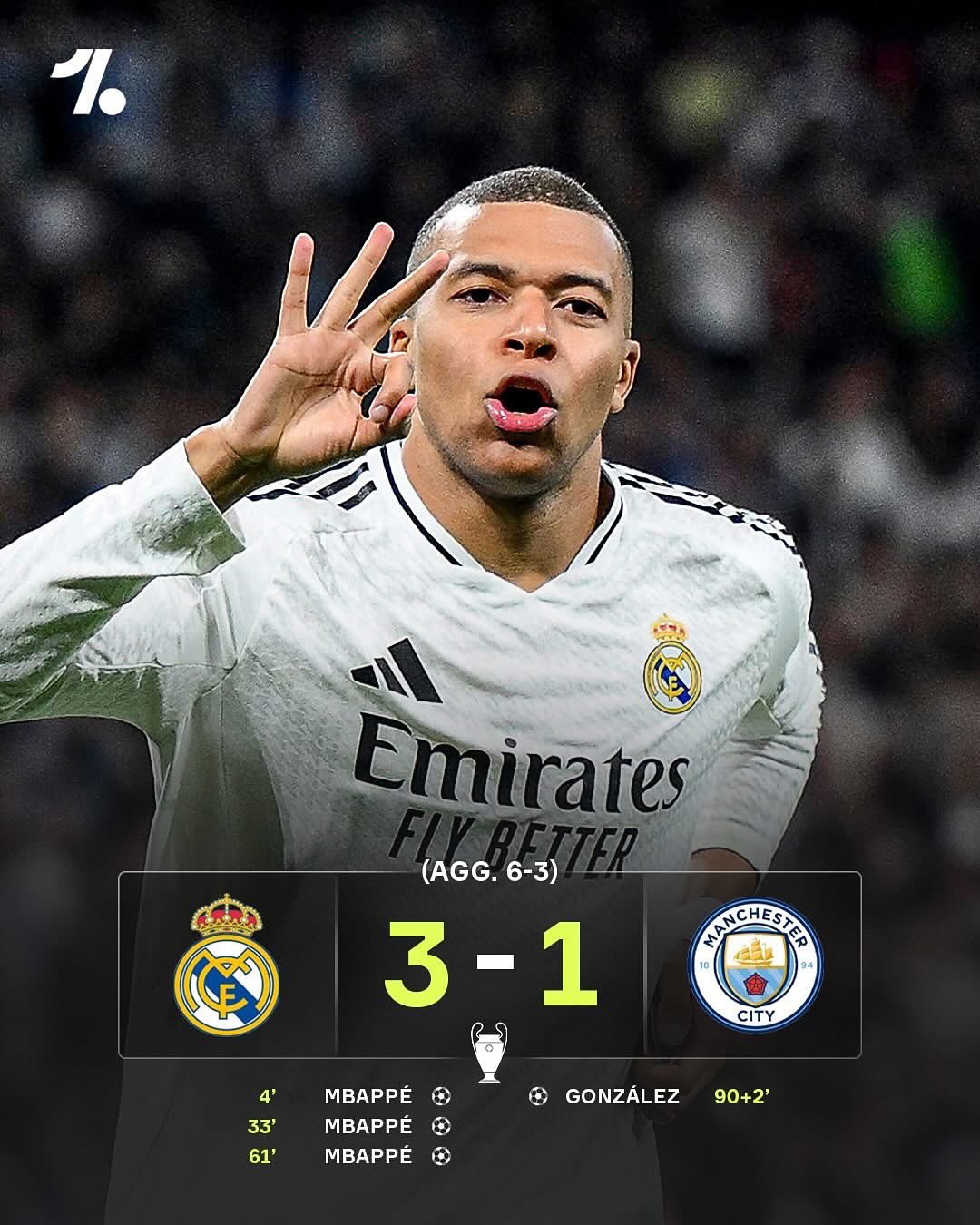 Two seasons in a row, a Real Madrid player has scored a hat-trick against Man City at the Bernabéu, with Kylian Mbappé doing so last season 🤯