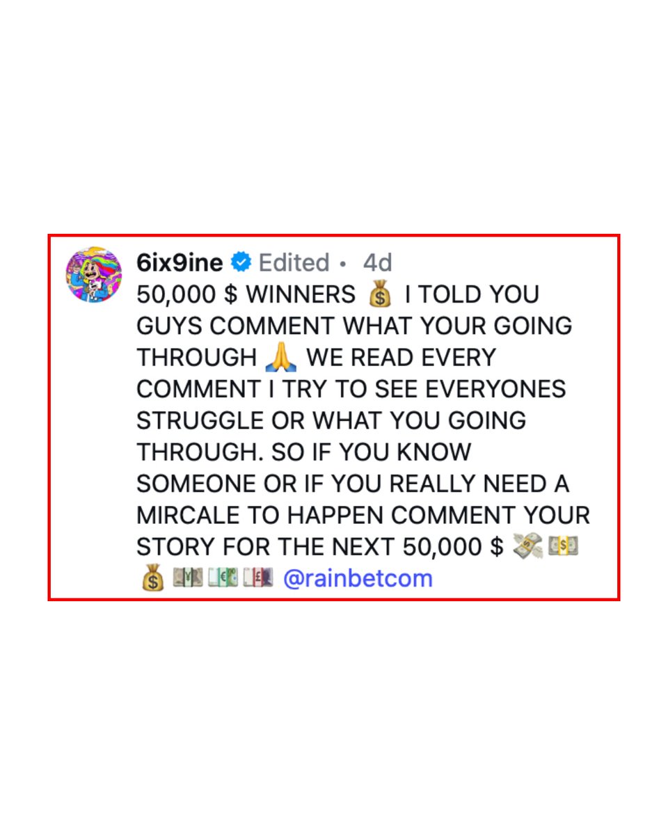6ix9ine gives $25,000 to two deserving families. Back on April 5, Tekashi announced on Instagram that he would be gifting $50,000 to someone in need who commented on his post, telling him why they could use the bread. On April 11, he kept true to his word. The Brooklyn, N.Y. rapper shared a video showing himself cashing out two families. "I thought it was kinda selfish to give one family $50,000," he said in the video. "So, I decided to break it in two and give each family $25,000 each." The first family 6ix9ine blessed in the video was a mother and father whose 7-month-old daughter is suffering from a rare disease called dilated cardiomyopathy and is in need of a heart transplant. 6ix9ine flew the couple in from Ohio to Miami to personally hand them the $25,000. 6ix9ine went to the home of the second family to pass off the paper. The giveaway is part of a new gambling app that 6ix9ine is promoting called RainBet. Tekashi says he will be doing the giveaways on a monthly basis. 6ix9ine was released from jail in New York City on April 3, after serving 90 days for parole violations. He is currently on probation in Miami.