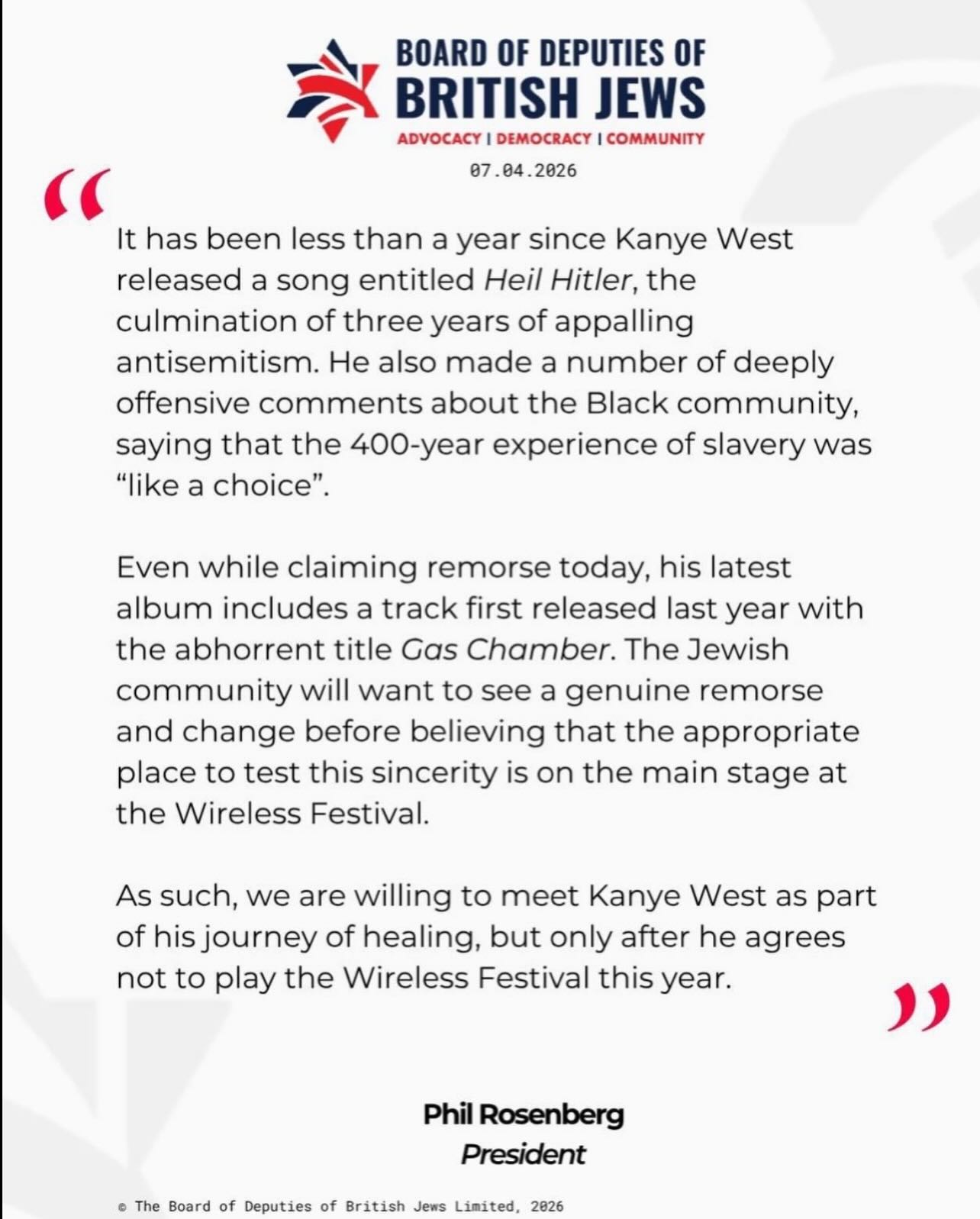 President of the Board of Deputies British Jews, Phil Rosenberg, also released a statement, writing that if Ye were to drop out of the festival, they’d be open to meeting with hin. “As such, we are willing to meet Kanye West as part of his journey of healing, but only after he agrees not to play the Wireless Festival this year.”