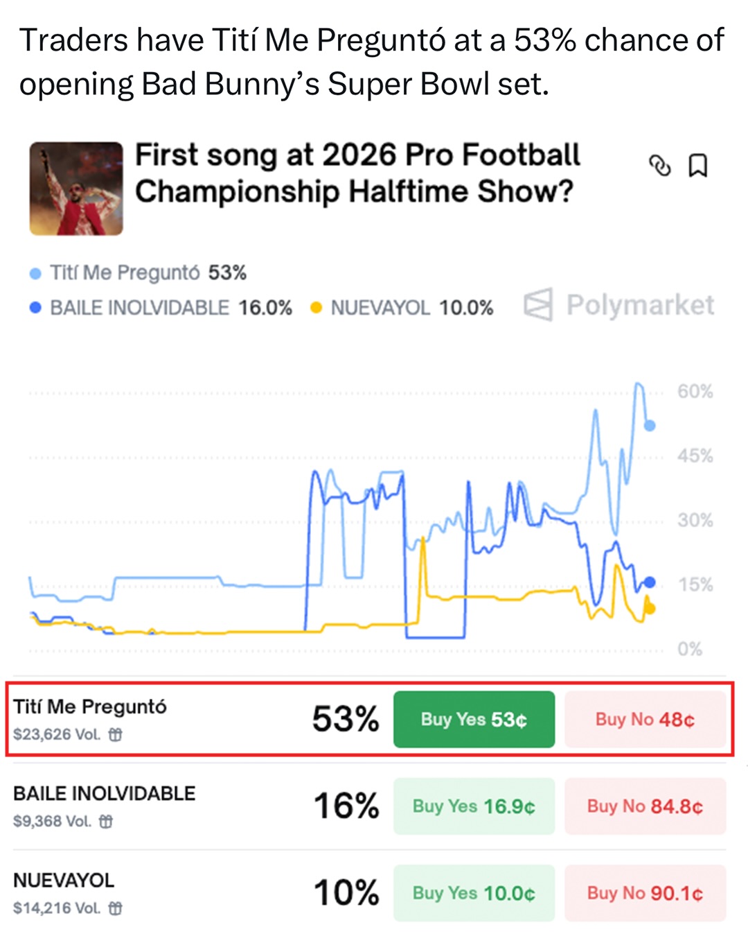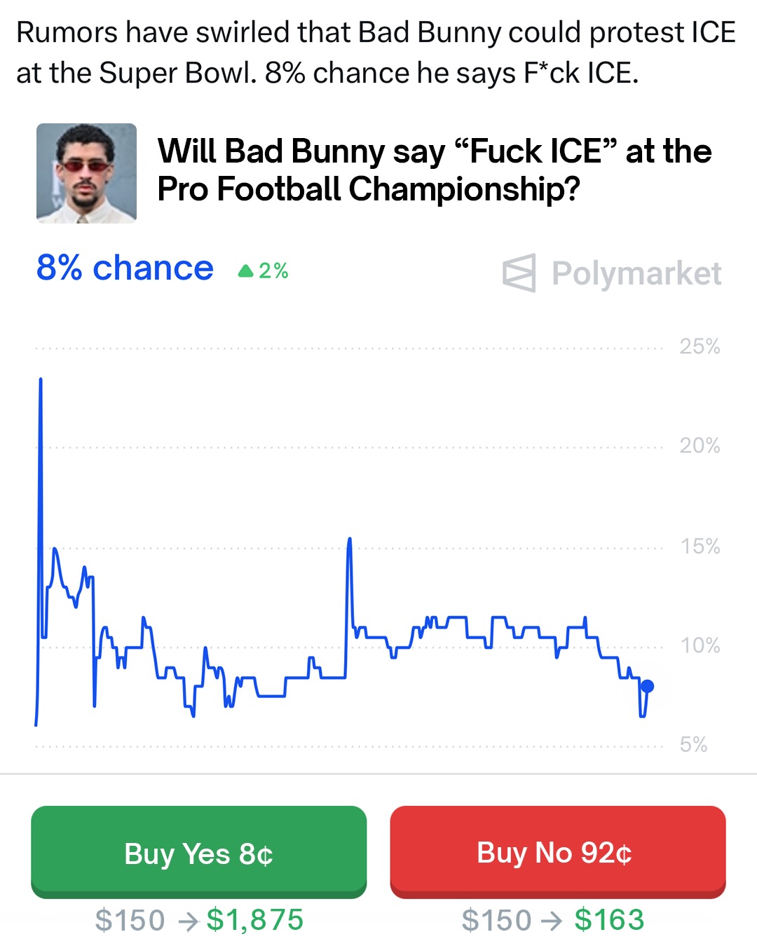 Traders predict only an 8% chance Bad Bunny will say “F*ck ICE” at the Super Bowl.