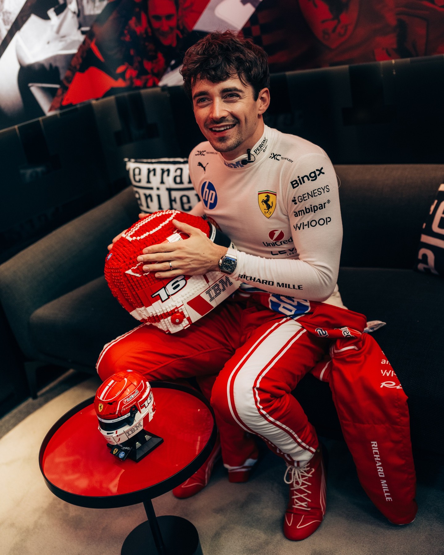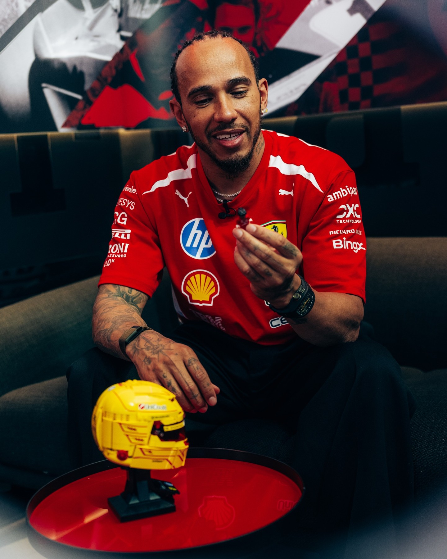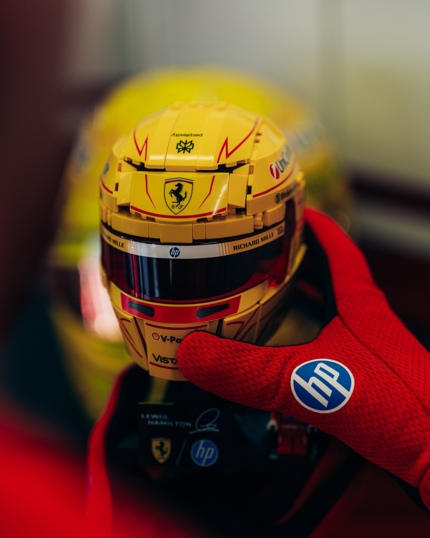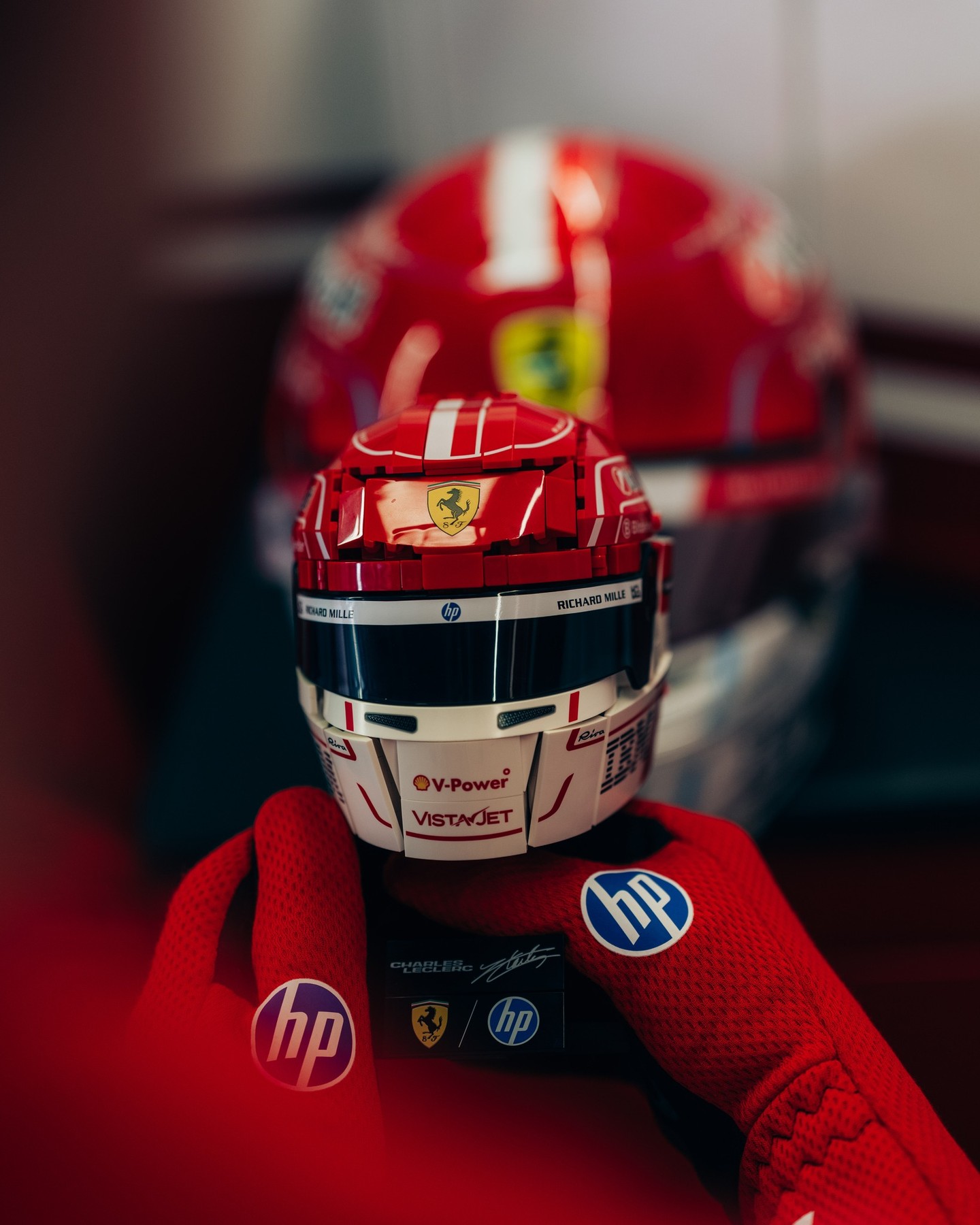 Lights out on the LEGO® Editions Scuderia Ferrari HP helmet sets for Charles Leclerc and Lewis Hamilton.